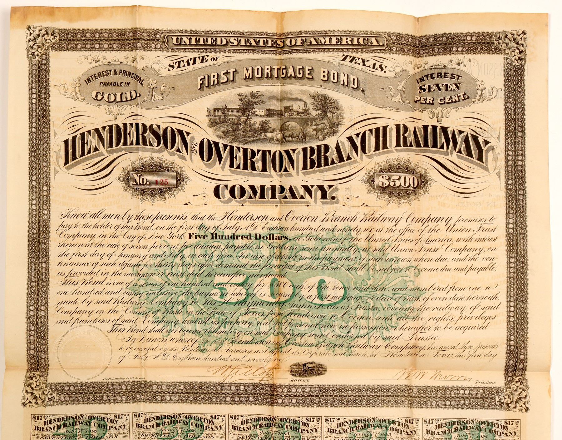 #125 of 180 authorized, I/U, $500 7% 20 yr. First Mortgage Gold bearer bond due 1896. Issued July 1, 1876. Signed W.W. Morris President, BLACK. Embossed seal w/4-4-0 center, vignettes: bottom 4-4-0 @ depot. Top 4-4-0 crossing bridge. "500" white outline on green underprint. Coupons #9-40 attached. The R. P. Studley Co. printer. EF cond Ken Prag Collection