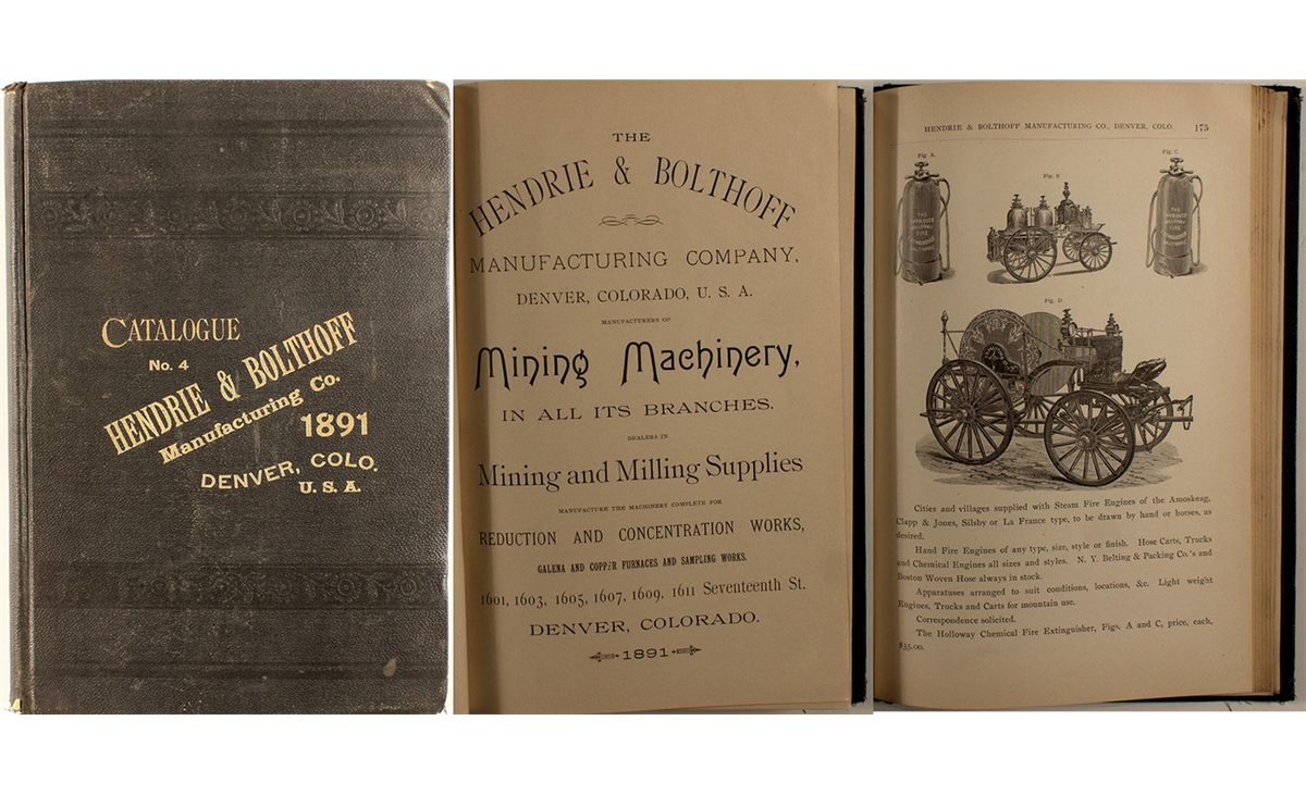 1891. "Manufacturers of Mining Machinery in all its branches. Dealers in Mining and Milling Supplies. Manufacture the machinery complete for Reduction and Concentration Works, Galena and Copper Furnaces and Sampling Works." Denver, Colorado. 261 pages. Black covers with gilt lettering. Detailed illustrations of tools Inscribed copy of A.E. Mosiee (?), "Received at Mosea Colo 1891." See prices and illustrations for mining lamps, fire fighting equipment, locomotive boilers, and much more. Mosea, Colorado is listed in the 1902 U.S. postal directory, but little information can be found about the town. Condition: chips on covers and spine. Toning. Rarity: [i]City: DenverCounty: DenverState: CODate: