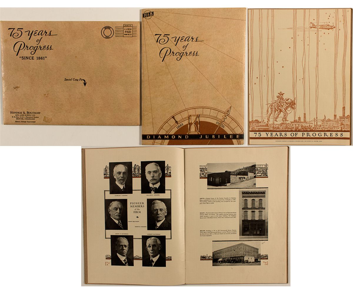 1936. "75 Years of Progress. 1861/ 1936. Diamond Jubilee." Crème-colored softcover. 32 pages with photographs. Includes a detailed description of the company's history with older and modern (1936) pictures. Great source of information about this important Denver supplier. Perfect companion piece for the catalogs themselves. Condition: slight toning, otherwise very nice condition. Comes with presentation envelope. Also included is a hand-written letter addressed to a Mr. Rorzio from Jess Mudgett, who works for H & B. Letter informs Rorzio that this brochure is the only source of old photos for the company they could find. Rarity: [ii]City: DenverCounty: DenverState: CODate: