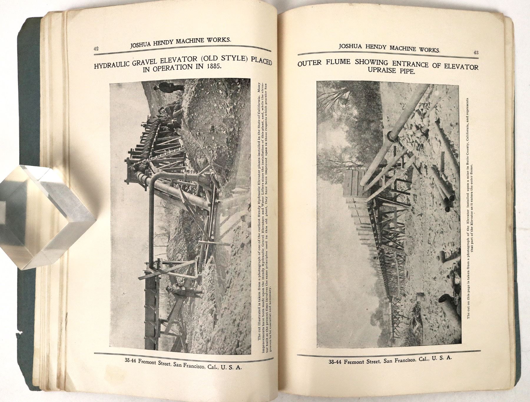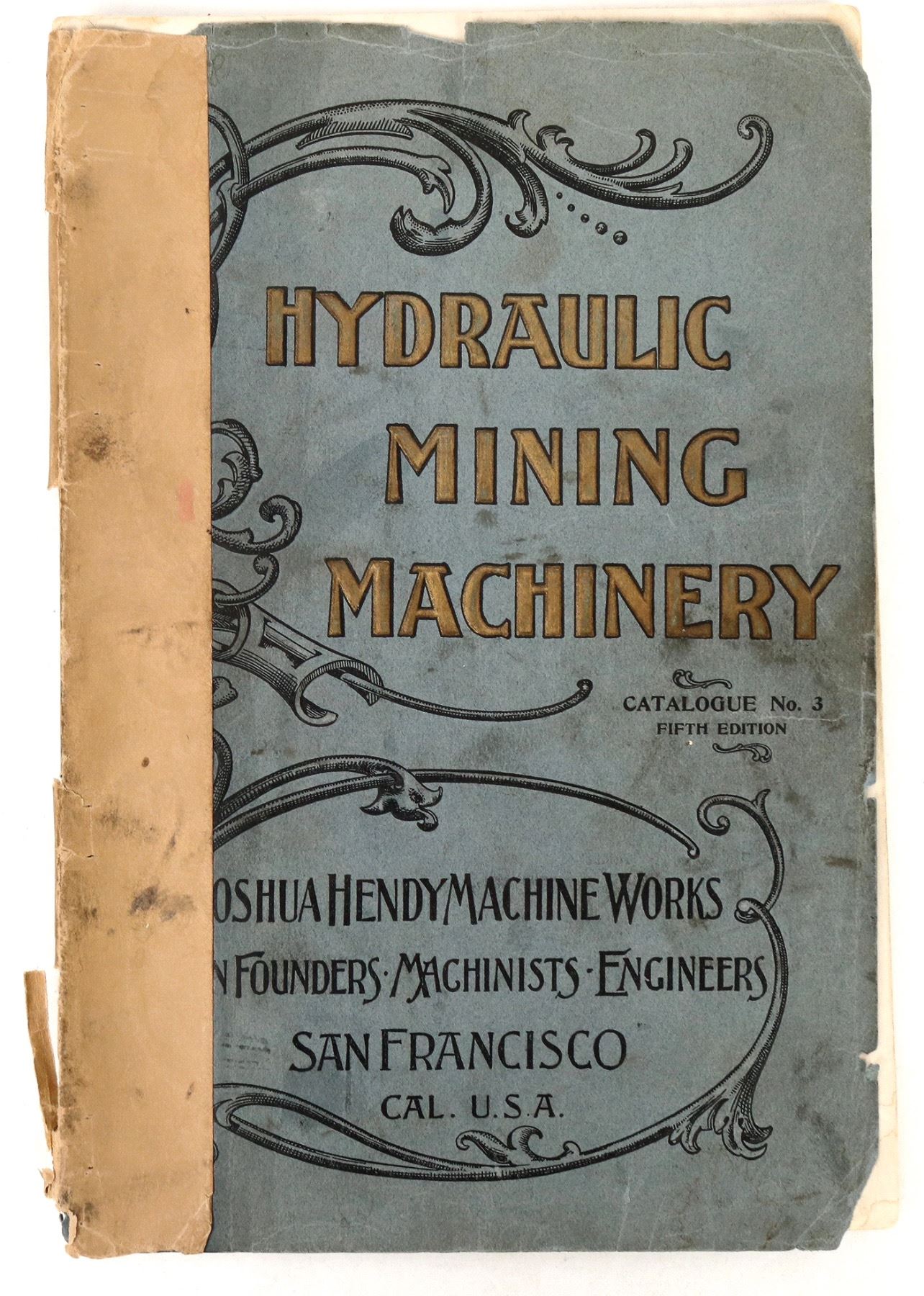 1900 Hendy Hydraulic Mining Machinery catalog. 72pp, Hydraulic mining illustrations and a few photos. Cover has brown tape on spine and is detached, light water stain. Please inspect.