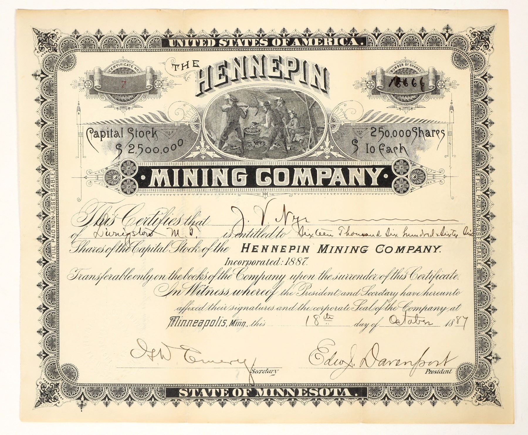 Hennepin Mining Company Stock Certificate Issued to Namesake of Mining Town [200305]