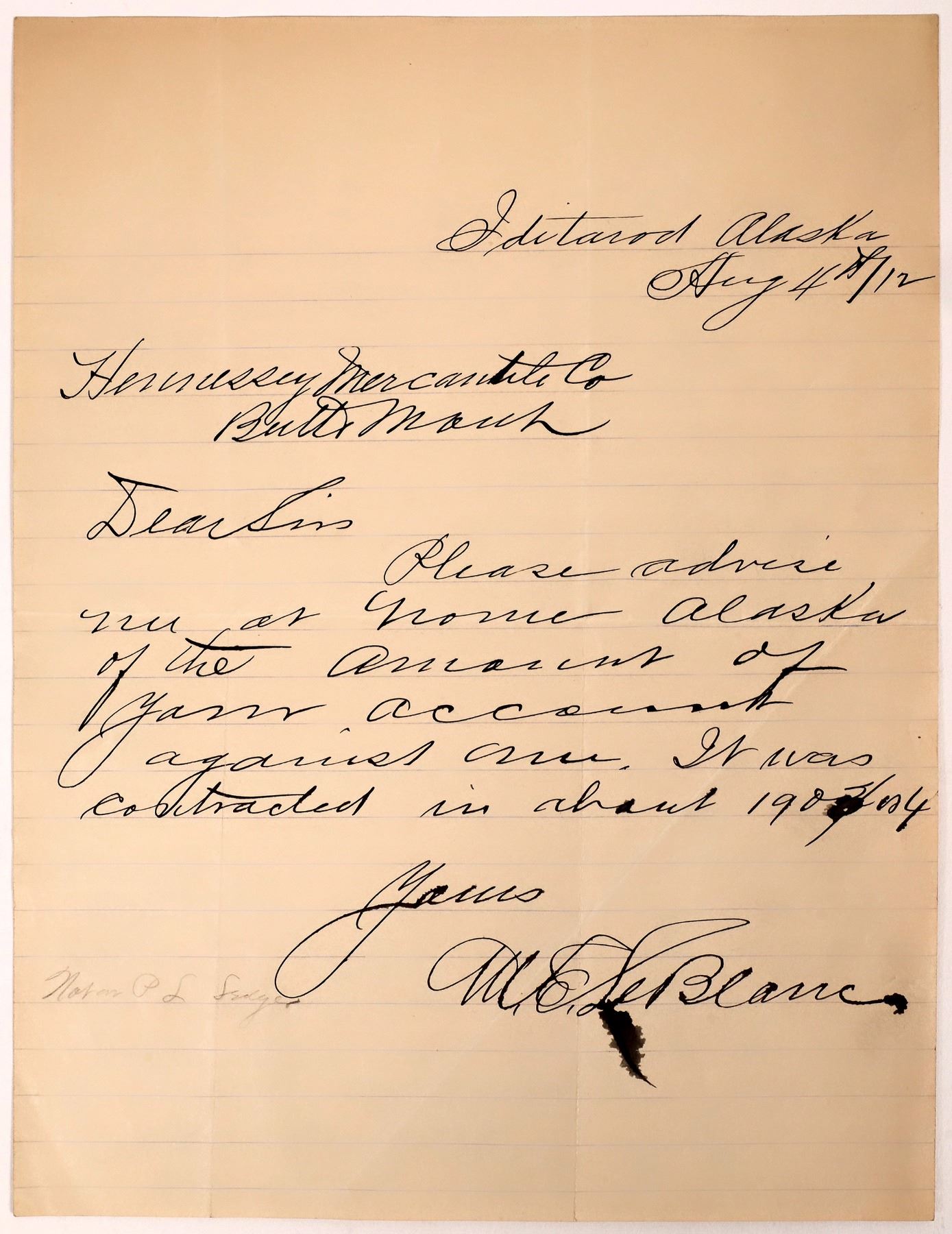Letter from Iditarod Alaska to the Hennessey Mercantile Company of Butte Montana dated August 4th, 1912. The Hennessy Company was a mercantile business in Butte, Montana, that operated in conjunction with the Anaconda Copper Mining Company. Branch stores were later established around the state. Montana Butte