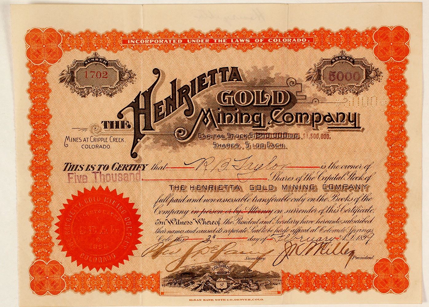Inc. in Colorado. No. 1702, issued for 5,000 shares to R.B. Taylor on Feb. 3rd, 1899. Signed by president J.K. Miller and secretary Phil. S. Delany. Not cancelled. Orange border, seal, and background. Vignette at bottom incorporating the Colorado state seal on top of mountains and next to mines. "Mines at Cripple Creek, Colorado" printed under logo. 7.5 x 9.75" Printed by Elgan Bank Note Co., Denver. Deep folds. Pinholes. Owns the BH Bryant, Midland ,and Hagerman claims on the north extension of Tenderfoot Hill. A shaft house and gallows frame including one shaft about 65 feet deep, and two or three from 40 to 60 feet. [Ref: 1900 Manual of Cripple Creek] (Al Adams Gold Rush Memorabilia Collection) Date: Location: Cripple Creek, Colorado HWAC# 59055