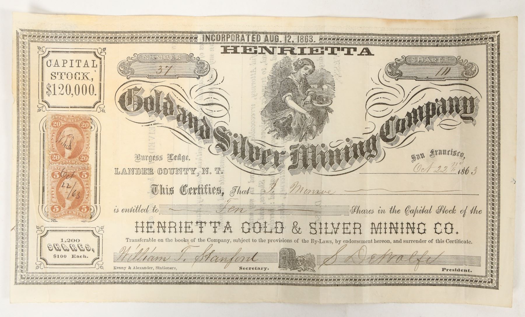 Burgess Ledge, Lander County, N.T. (printed under logo at left). Inc. Aug. 12, 1863. Dateline San Francisco, Oct. 22nd, 1863. No. 37, issued for 10 shares to Monroe. Signed by S. DeWolfe as president and William Stanford as secretary. Not cancelled. Vignette of woman sitting (top center) and dog next to safe (bottom center). Printed by Kenny & Alexander. Many folds and some staining. Please inspect. Not listed in Filer. Not listed in the 1863 Langley Directory. Reese River Mining District.