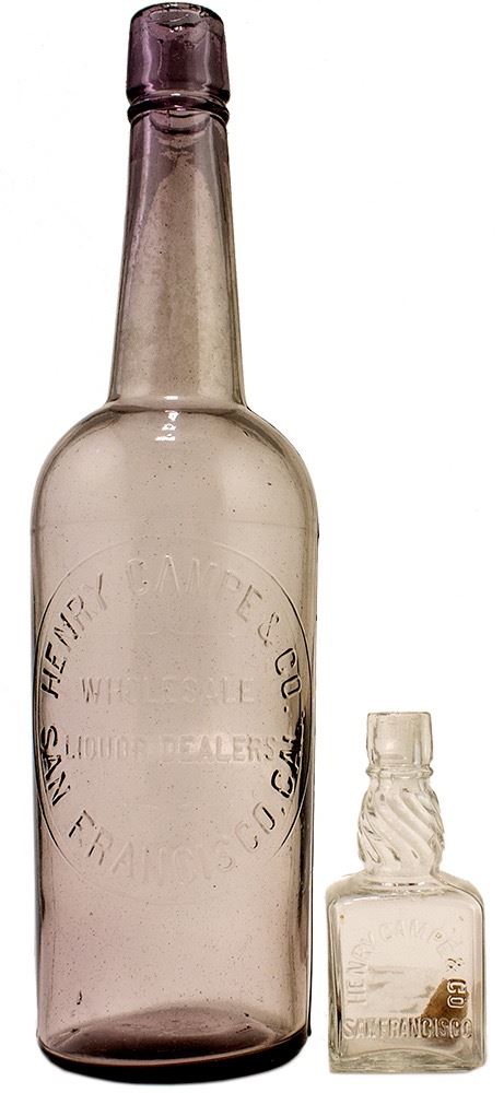 Suite of two different Henry Campe Co., San Francisco whiskey bottles. The first is the miniature Henry Campe, a square whiskey bottle with a fluted neck. The second is the classic fifth, four piece mold. Clear, turning purple, Barnett 92. City: San Francisco State: California Inventory Number: 36177