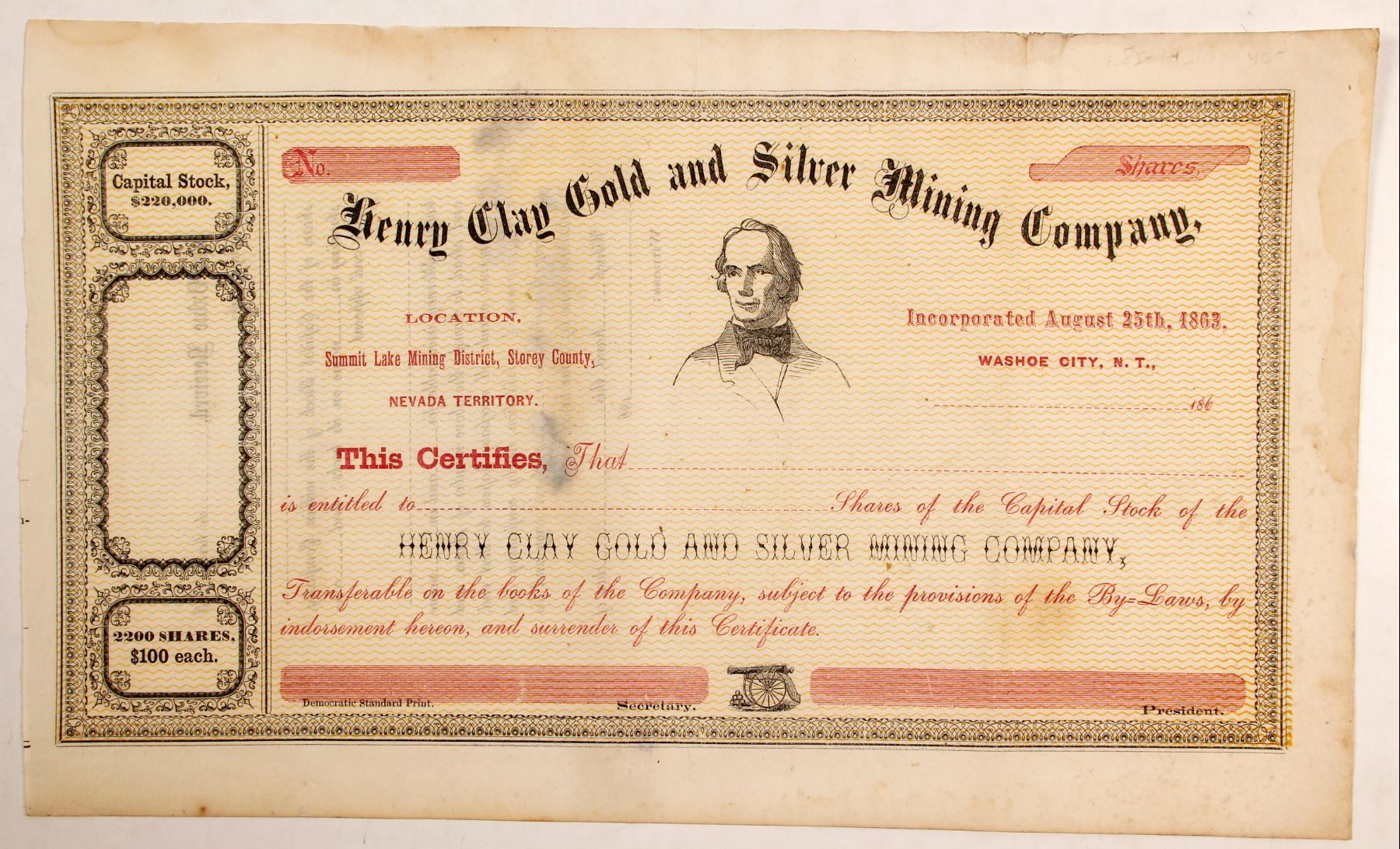 Unissued. Incorporated August 25th, 1863. Dateline Washoe City, N. T. Location: Summit Lake Mining District, Storey County, Nevada Territory.Printer Democratic Standard Print. The Democratic Standard was a rare, short-lived Virginia City newspaper. It began on August 10, 1863 and lasted only two months. [Newspapers of Nevada by Lingenfelter]"The Flowery portion, also known as Rogers or Summit Lake, is located in the Flowery Range, to the east." [Mining Districts of Nevada by Tingley] State: Nevada City: Summit Lake Mining District Date: 1863 HWAC# 84560