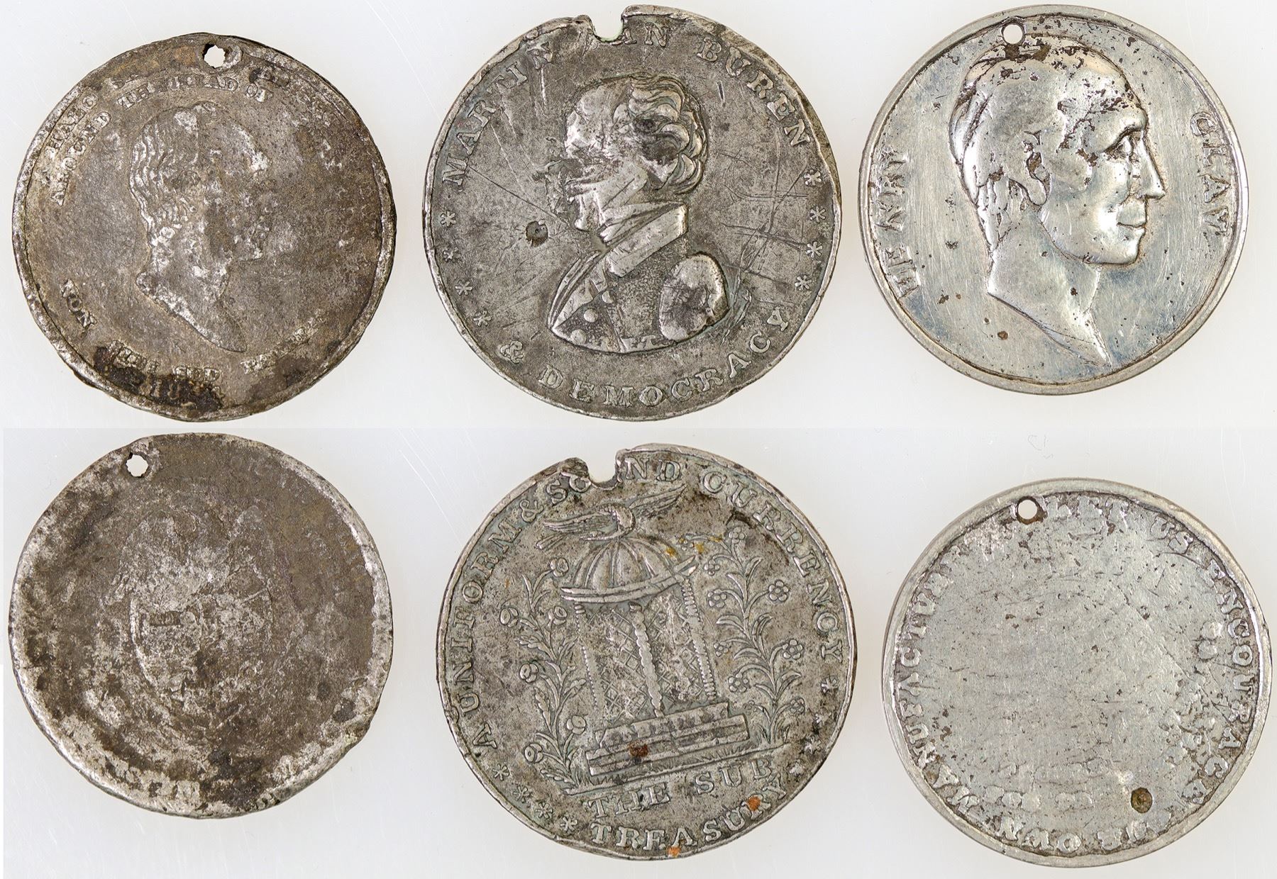 Three medals from early American history. Henry Clay (white metal, holed reverse illegible); Martin Van Buren (white metal, holed, wording illegible) and a third portrait medal, illegible. All in poor condition. City: State: Date: