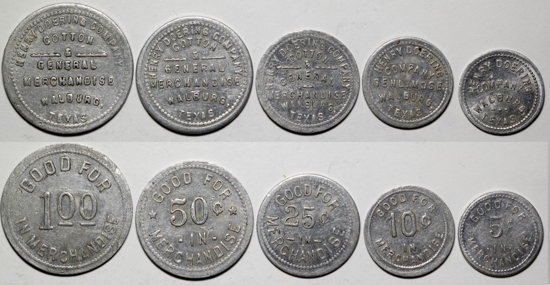 Set of five tokens 5c, 10c, 25c, 50c, and $1.00 from merchant in this German settled town. State: Texas City: Walburd Date: HWAC# 85409