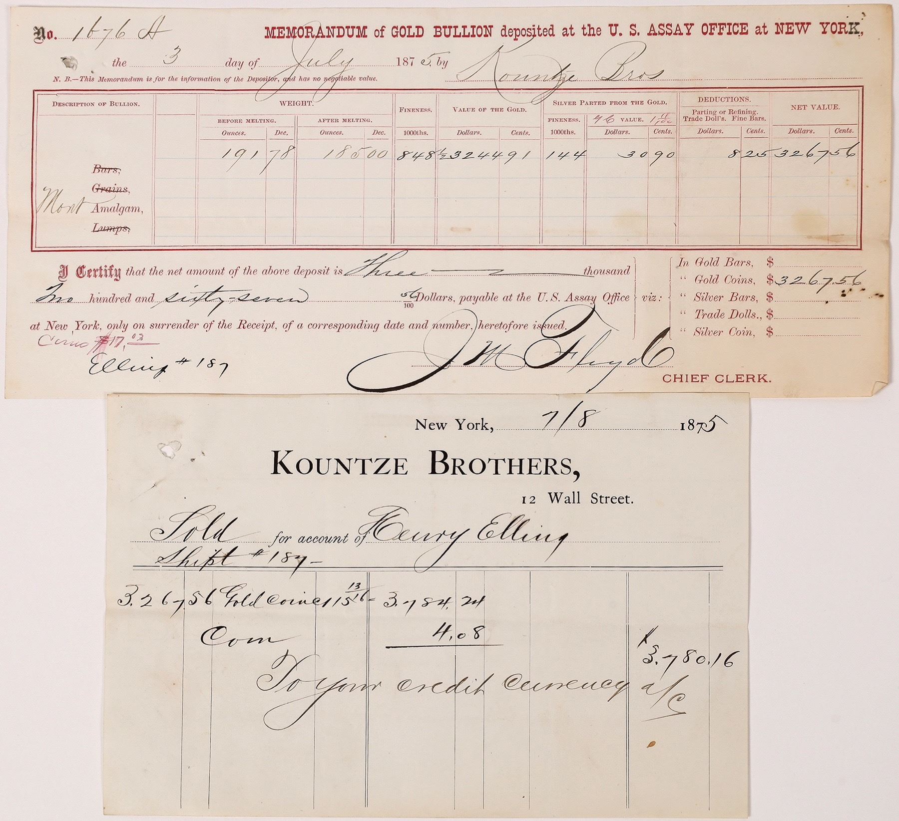 1875 receipt and Memorandum US Assay Office NY.191.78 oz. Elling was paid in gold coin.