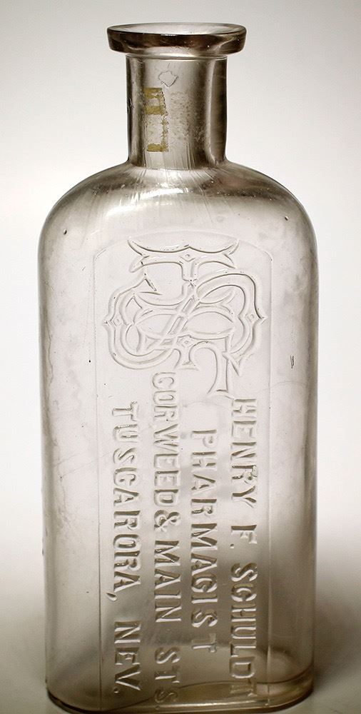 ( Monogram : H. F. S. , at Shoulder ) : Henry. F. Schuldt / Pharmacist / Cor. Weed & Main Sts./ Tuscarora, Nev// Base; Plain n Flat, very early variant . Clear, tooled top. Great condition, except for a tiny, 1/16" base flake, and little light haze on the reverse side of the bottle. Extremely rare in this larger size. HWAC# 59266 Date: 1878-1879 Location: Tuscarora, Nevada
