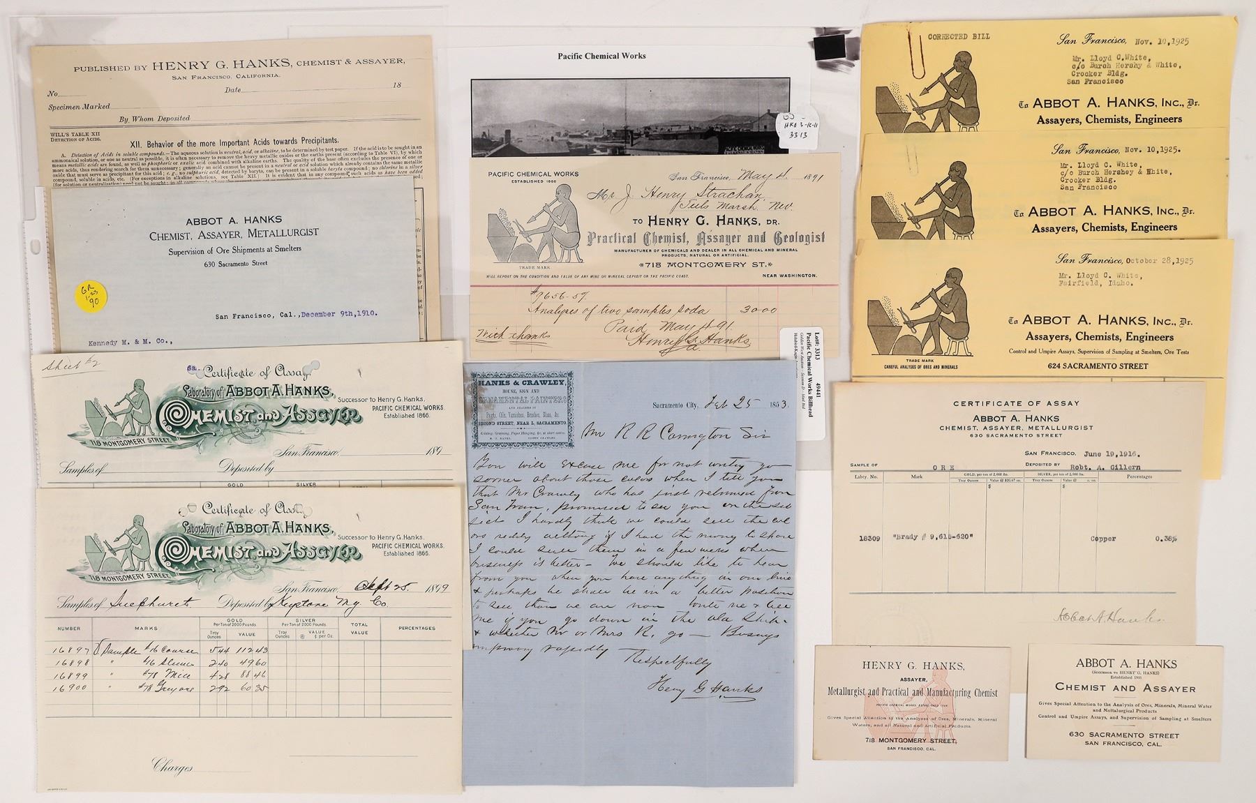 Lot of 12. Fantastic collection. This assayer is known to collectors for his unique use of Egyptian assay motifs for his business documents. Henry G. Hanks was born in 1826. He worked in India for a year and came back to American where he travelled the states. By 1850 (US Census) he was living in Cleveland and working as a sign and house painter (probably with his father). From 1852 to 1856 he worked in various mines in California and engaged in several businesses in Sacramento. An obvious business would be as a painter as he had experience in this. In the 1860 census he is living in San Francisco and his occupation is listed as a paint dealer. In 1866 everything changed for him. He opened his own assay company, the Pacific Chemical Works. In 1880 he was appointed California's State Mineralogist - a position he held until 1866. Under his guidance a museum and library were created. In 1878 Hanks was sent as mineral commissioner to the Paris Exposition. In 1885 he went to New Orleans and in 1893 to Chicago in the same capacity. He was founder of the Microscopical Society of San Francisco and was considered to have the finest mineral specimen collection in the city. [The Mineralogical Record: Biographical Archive] 1-2) Two different business cards. Earlier piece (c.1880s-90s) is for Henry G. Hanks, Pacific Chemical Works, 718 Montgomery Street. Underprint Egyptian assay vignette (same on reverse). Later card is for when his son, Abbot A. Hanks, now ran the business, located at 630 Sacramento St. 3) 1853 letterhead for Hanks & Crawley, Ornamental Painters, Sacramento City. This was what Hanks was doing before starting the assay business. Signed by Henry Hanks. 4) Fantastic 1891 pictorial SF billhead for Henry G. Hanks, Practical Chemist, Assayer & Geologist. Billed to J. Henry Strachan of Teels Marsh, Nevada (the site of "Borax" Smith's first borax works at Marietta, Nevada in 1872). For analyses of soda. Egyptian vignette. 5-6) Two page Assay Certificate for Abbot A. Hanks, 1899, for assays to the Keystone Mining Company. Egyptian vignette. 7) Henry G. Hanks form listing Will's Table XII (Detection of Acids) "Behavior of the more important Acids towards Precipitants" - Blank date 18__. The form reflects the wide aperture and diversification on chemical analysis. 8) 1910 letterhead for Abbot A. Hanks to Kennedy M&MC. 9) 1916 Certificate of Assay for Abbot A. Hanks. 10-12) Three pictorial receipts for Abbot A. Hanks, 1925, for Lloyd White of Fairfield, Idaho. Egyptian vignette. San Francisco California Franklin Collection