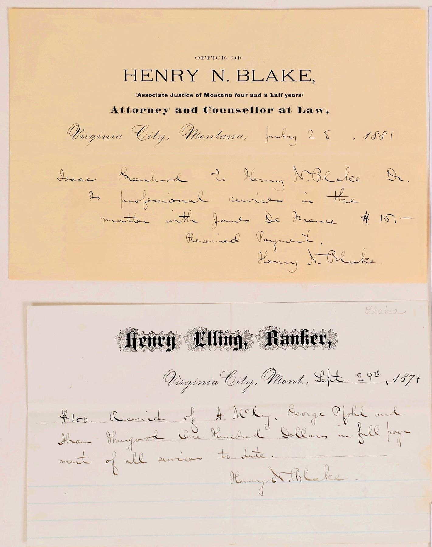 2 Henry N Blake autograph signed letters, c.1881 and 1887. He was a Chief Justice of the Montana Supreme Court. About 3.5x7.5" each.