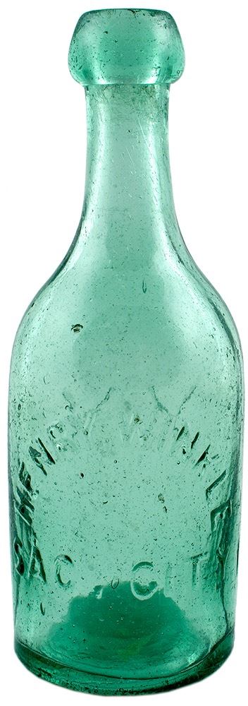 Henry Winkle, Sac (ramento) City, XX. Choice 1852-1854 California Gold Rush soda bottle. Winkle was unusual, using aqua glass to show off the color (or clarity) of his soda water. Most are full of bubbles, made with a very crude glass, and all are pontiled. This example is a green-aqua, and about as nice as you'll ever see for a Gold Rush era soda. Markota has quite a story of Winkle in his book on California soda bottles. City: Sacramento State: California Inventory Number: 39540