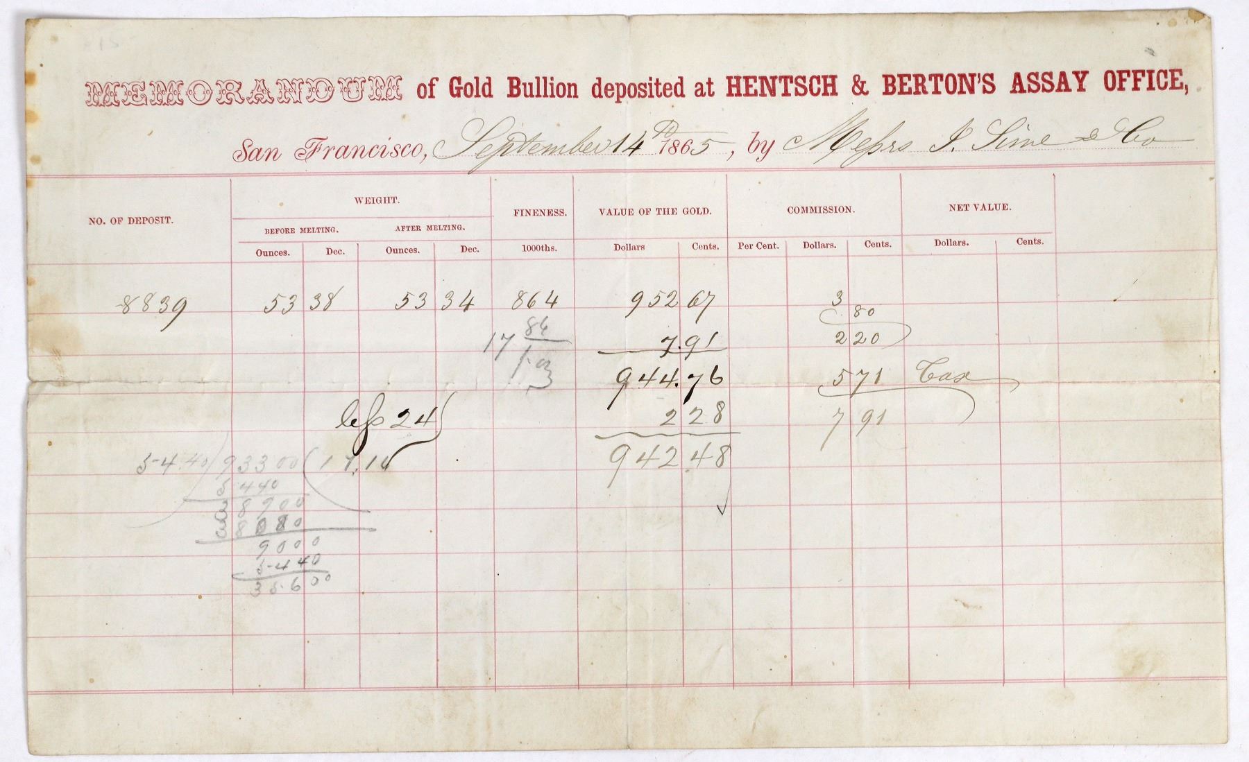 Very rare; possibly unique. Ex. John J. Ford Jr. Collection. Memorandum of Gold Bullion deposited at Hentsch & Berton's Assay Office. Dateline San Francisco, September 14th, 1865 by bankers Sime & Co. On deposit, 53.38 ounces, made into a 53.34 ounce bar, .864 fineness. 6.5 x 10.5" Red print on creme paper. Folds, soiling, small tears, tape repair on reverse. Hentsch & Berton were the successors in 1863 to Henry Hentsch's banking and assay business in San Francisco. Hentsch was born in Geneva in approximately 1830 and arrived in California in 1849. After working in Grass Valley and Sonoma he opened an assay office and bank in San Francisco around 1856. Hentsch is perhaps best known to numismatists by the rare Hentsch gold ingots found at the wreck site of the S.S. Central America, which sank in 1857. Ephemera from Hentsch is even rarer than the ingots. San Francisco California 1865