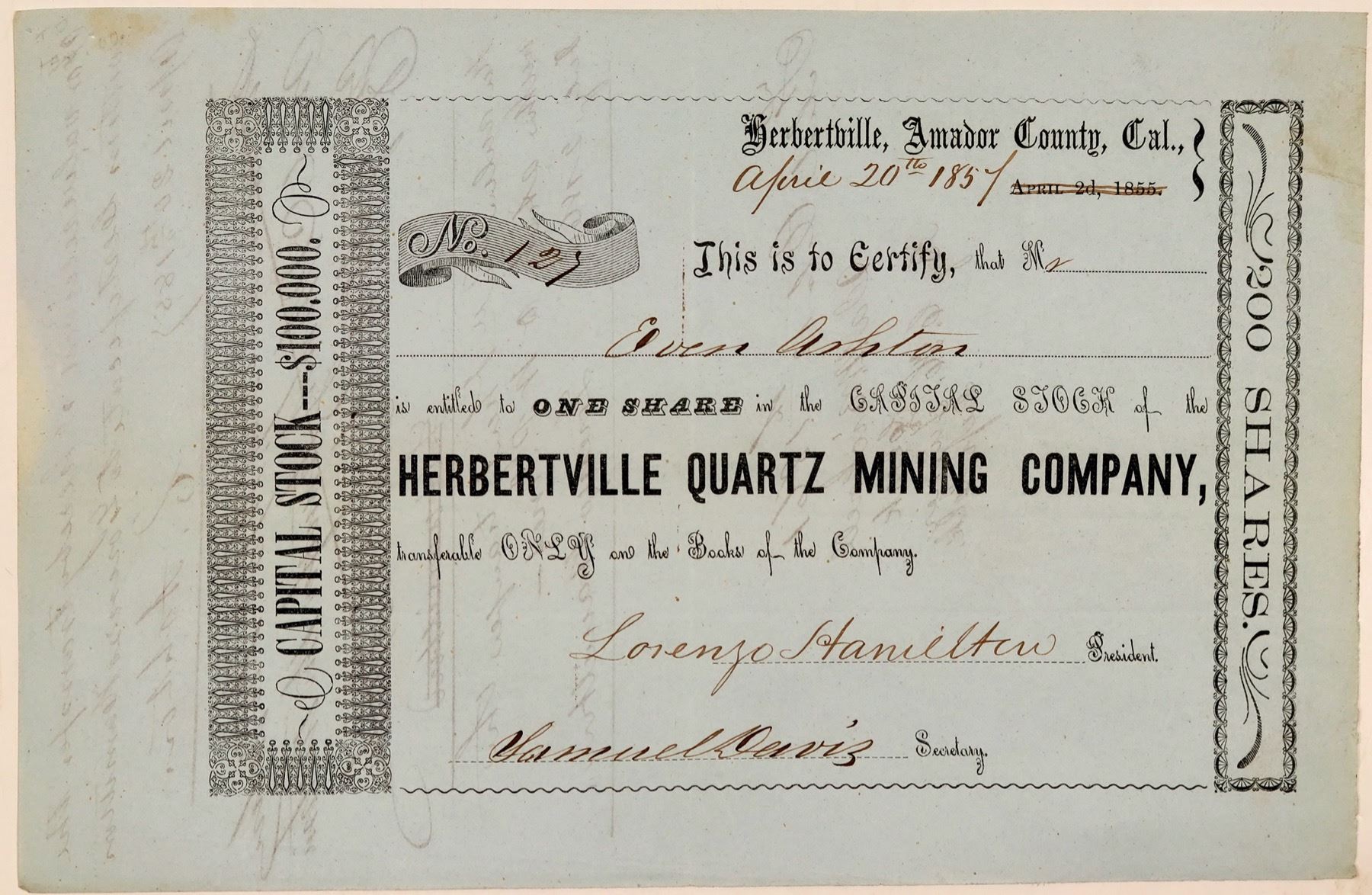 No. 127, issued to Even Ashton for one share. Signed by Lorenzo Hamilton, President, and Samuel Davis, Secretary. Incorporated in California in 1855. Blue paper, no vignette, no printer indicated, 5X8 inches. Uncancelled. This mine was located in the early 1850's, was renamed the Talisman and even later would become a part of the Springhill Mine. It produced free gold quartz, averaging about one ounce per ton. In 1852, there were three arrastras and a 20-stamp mill in operation. The city of Herbertville, Amador County began in 1851 and was named after reverend Lemuel Herbert, who was an owner of Spring Hill Mine. One of the first Quartz Gold mines in California. Extremely fine. (Ref. HA 33-180 9-20-04 P324)