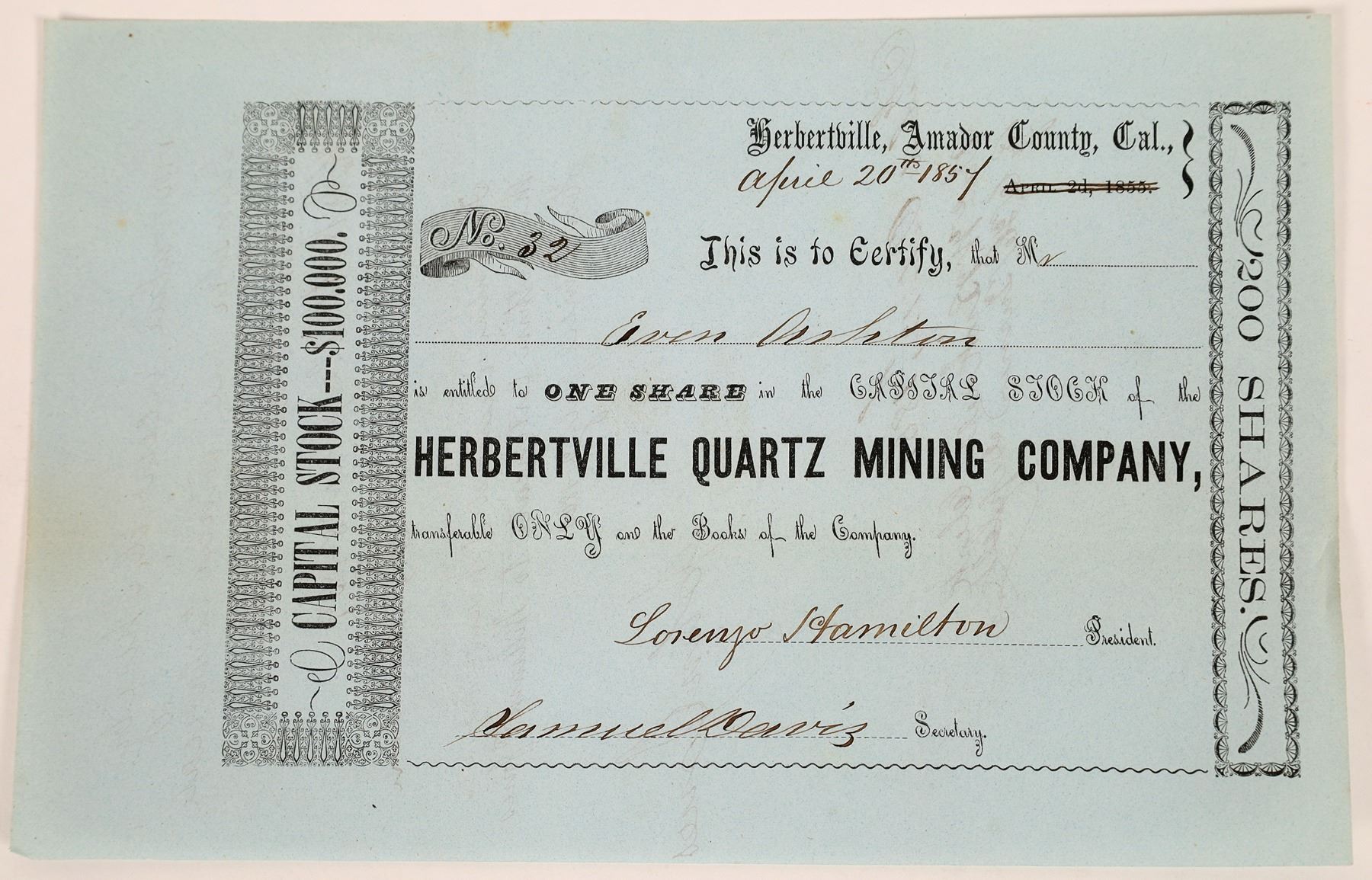 No. 32, issued to Evan Ashton for one share. Signed by Lorenzo Hamilton, President, and Samuel Davis, Secretary. Incorporated in California in 1855. Blue paper, no vignette, no printer indicated, 5X8 inches. Uncancelled. This mine was located in the early 1850's, was renamed the Talisman and even later would become a part of the Springhill Mine. It produced free gold quartz, averaging about one ounce per ton. In 1852, there were three arrastras and a 20-stamp mill in operation. The city of Herbertville, Amador County began in 1851 and was named after reverend Lemuel Herbert, who was an owner of Spring Hill Mine. One of the first Quartz Gold mines in California. Extremely fine. (Ref. HA 33-180 9-20-04 P324)