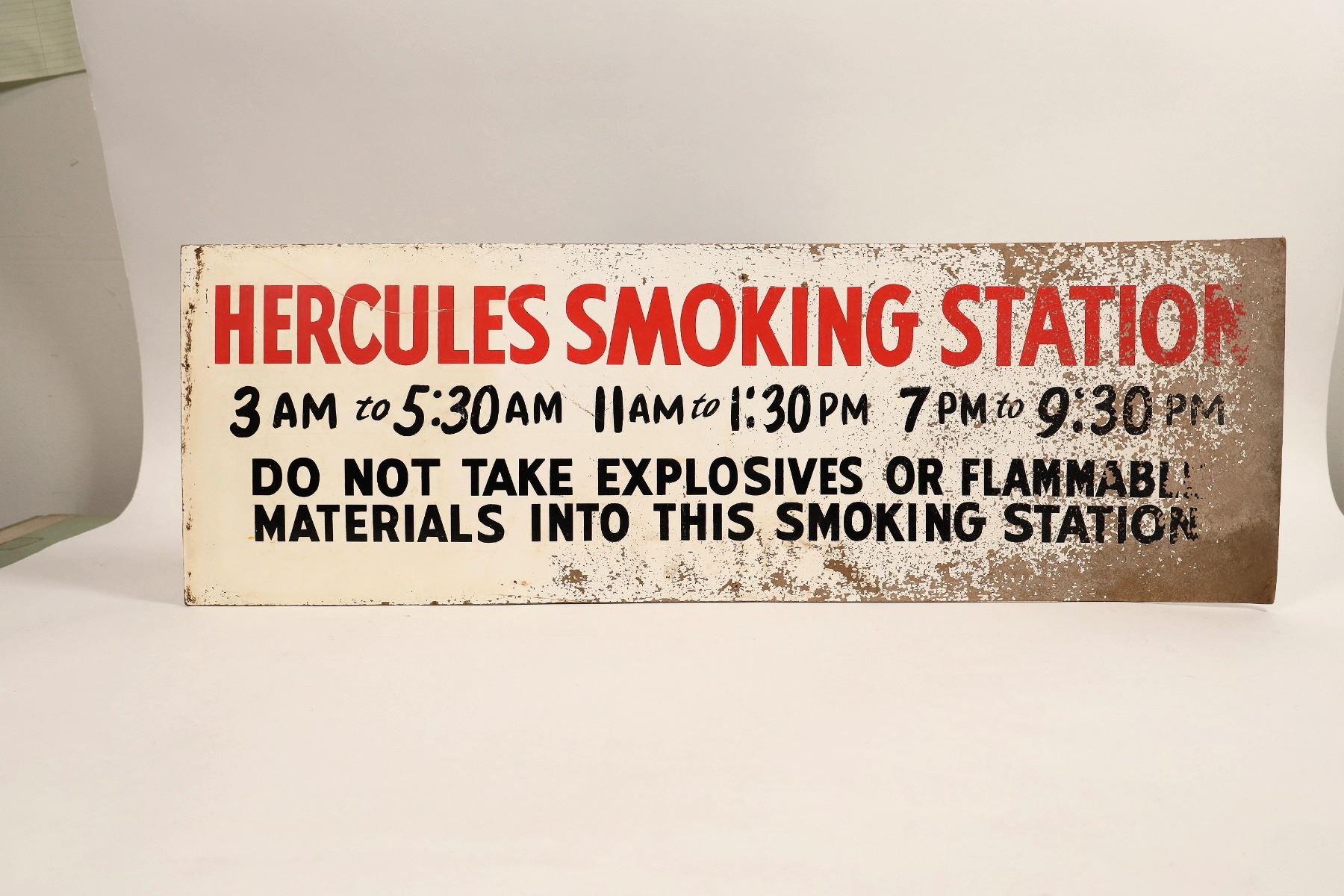 Original mid 20th century sign made by the Hercules Powder Company. Quote Hercules smoking station/space 3 AM to 5:30 AM, 11 AM to 1:30 PM, 7 PM to 9:30 PM/space do not take explosives or flammable materials into this smoking station" three please long 1 foot wide. This is a unique sign, red and black lettering on white paint background printed on anise best this sheet. Paint at right is chipping but the sign is still fully readable. We've sent never seen another like it, this is a must for the Hercules collector