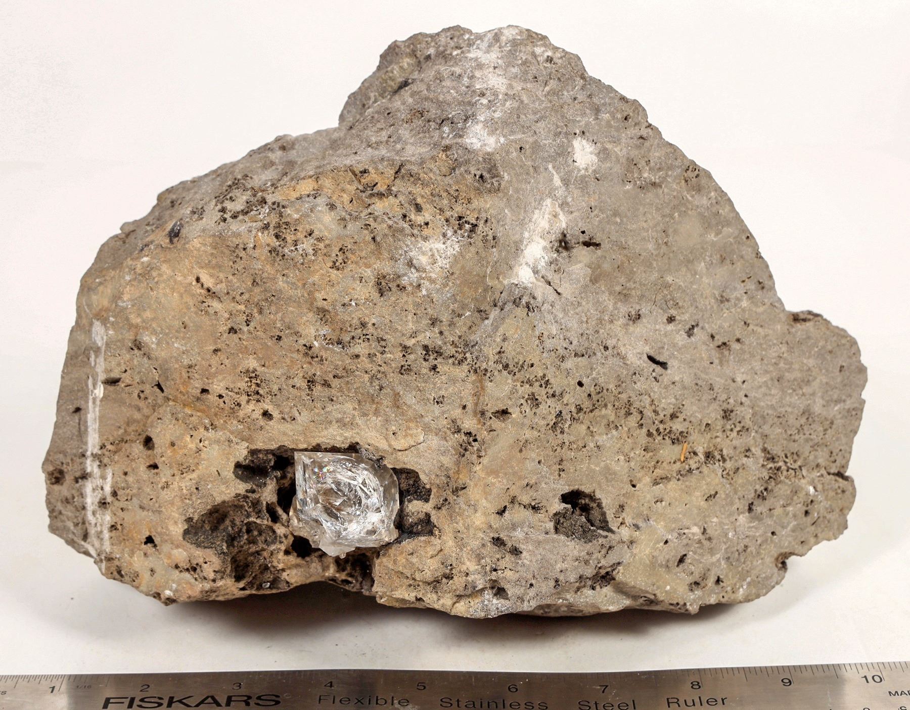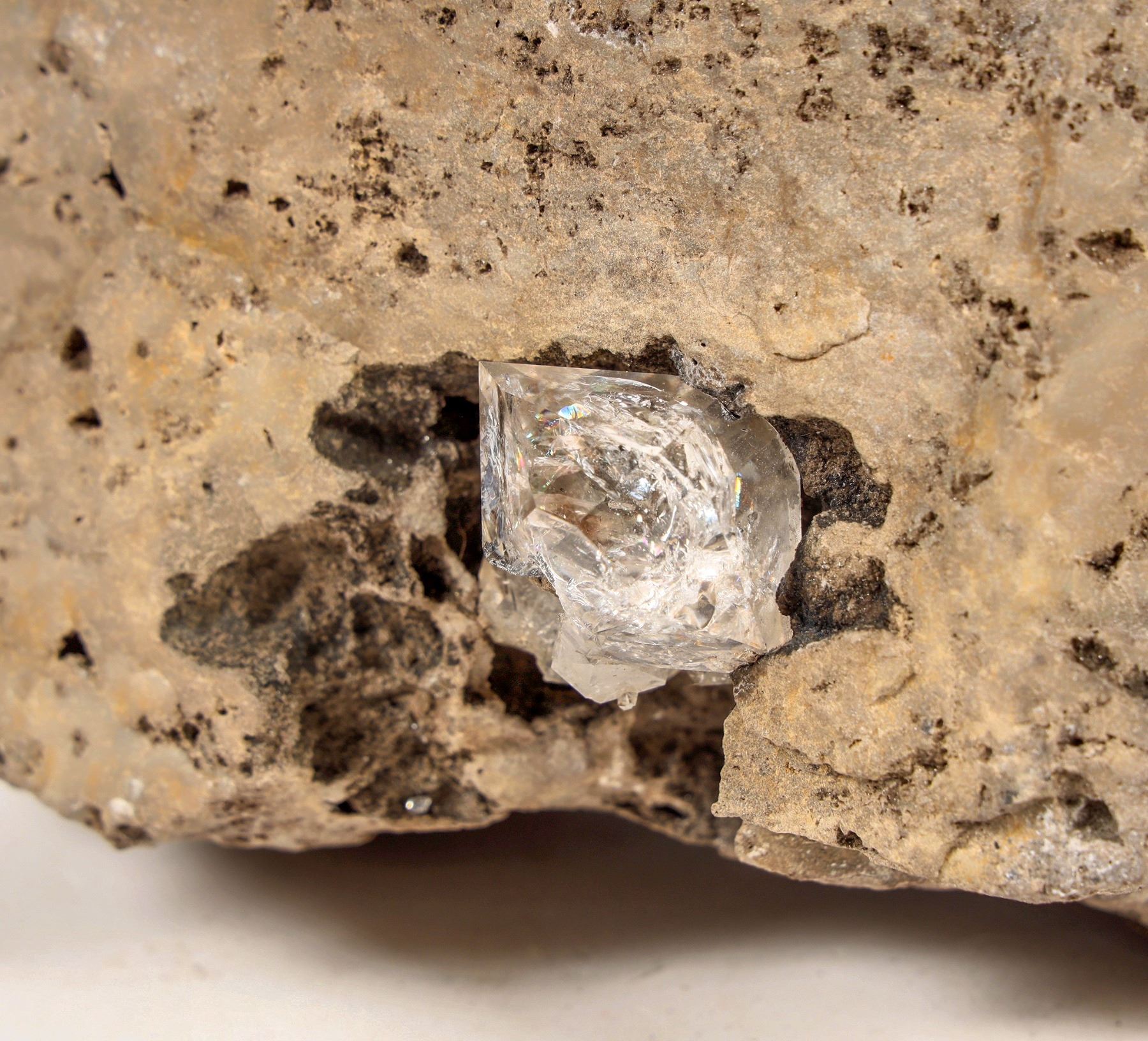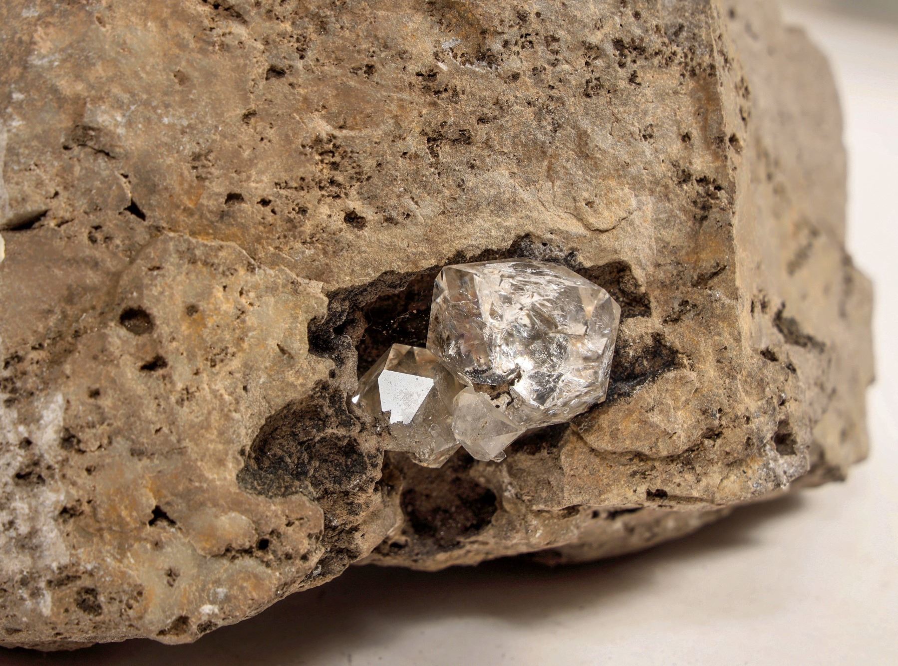 Large Herkimer Diamonds on Dolomite matrix. This massive rock measures approximately 10 x 8 x 6 inches and has vugs that are pale to dark gray with visible sparkly drusy. Prominent, large crystals protrude from one surface, near the top center of the rock face. 4 Visible crystals clustered together measuring 1.5 x 2 x 1 approximate inches as grouped, nested into vug lined with pale grey drusy with sparkle. This dolostone has several display options, vertical or horizontal. It would be perfect piece for a high glass shelf with the cavity and diamonds on the low corner edge. If lit and viewed from below the cavity and crystals would be lit up and easily visible, even on a high shelf that is above eye level and usually worthless for viewing display specimens.