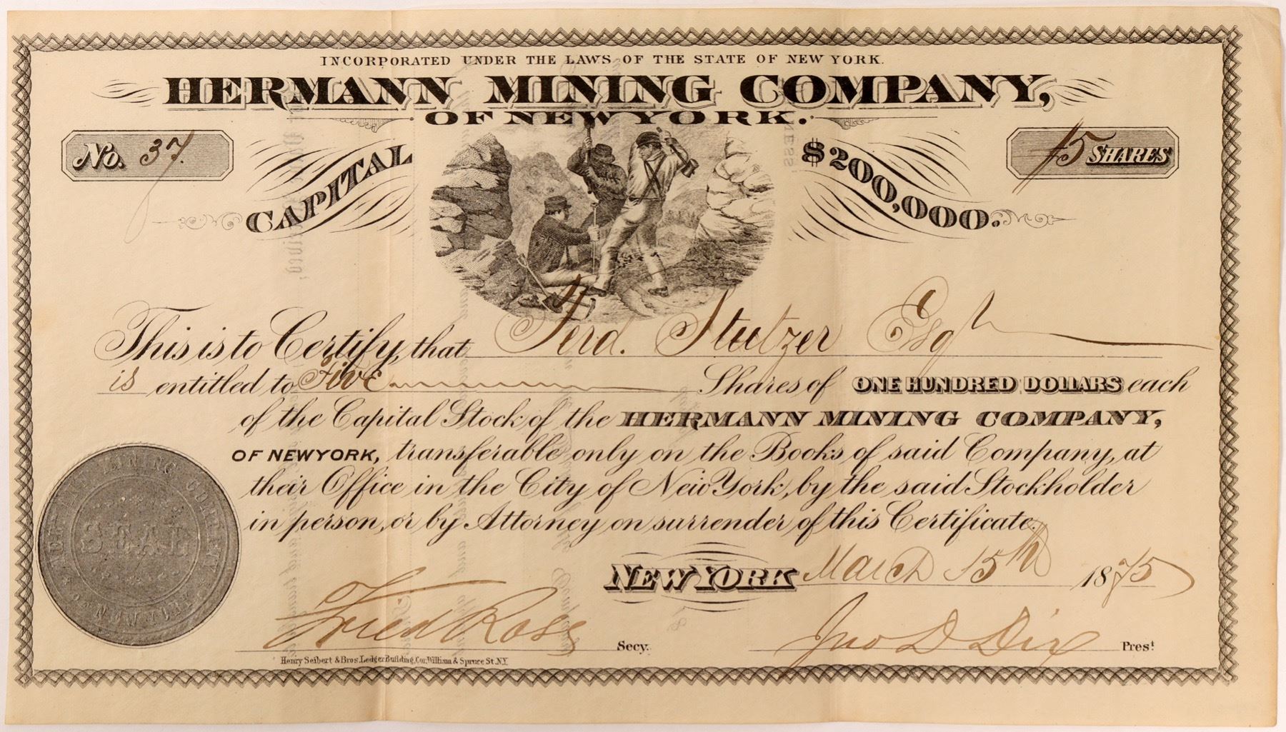 Stock Certificate from the Hermann MC of New York. Incorporated in New York. Located at Clear Creek. Certificate number 37. Issued in 1875 at New York to Ferd. Stutzer Esq. Signed by president Jonathan D. Dix, and Ross. Printed by Henry Seibert & Bros., Ledger Building, William & Spruce St NY. Not cancelled. Some edge wrinkling, etc. Over all nice. 'C+L' - Clear Creek County. Raised seal, Vignette of working miners. Grey border. This company was still holding annual meetings in 1885.