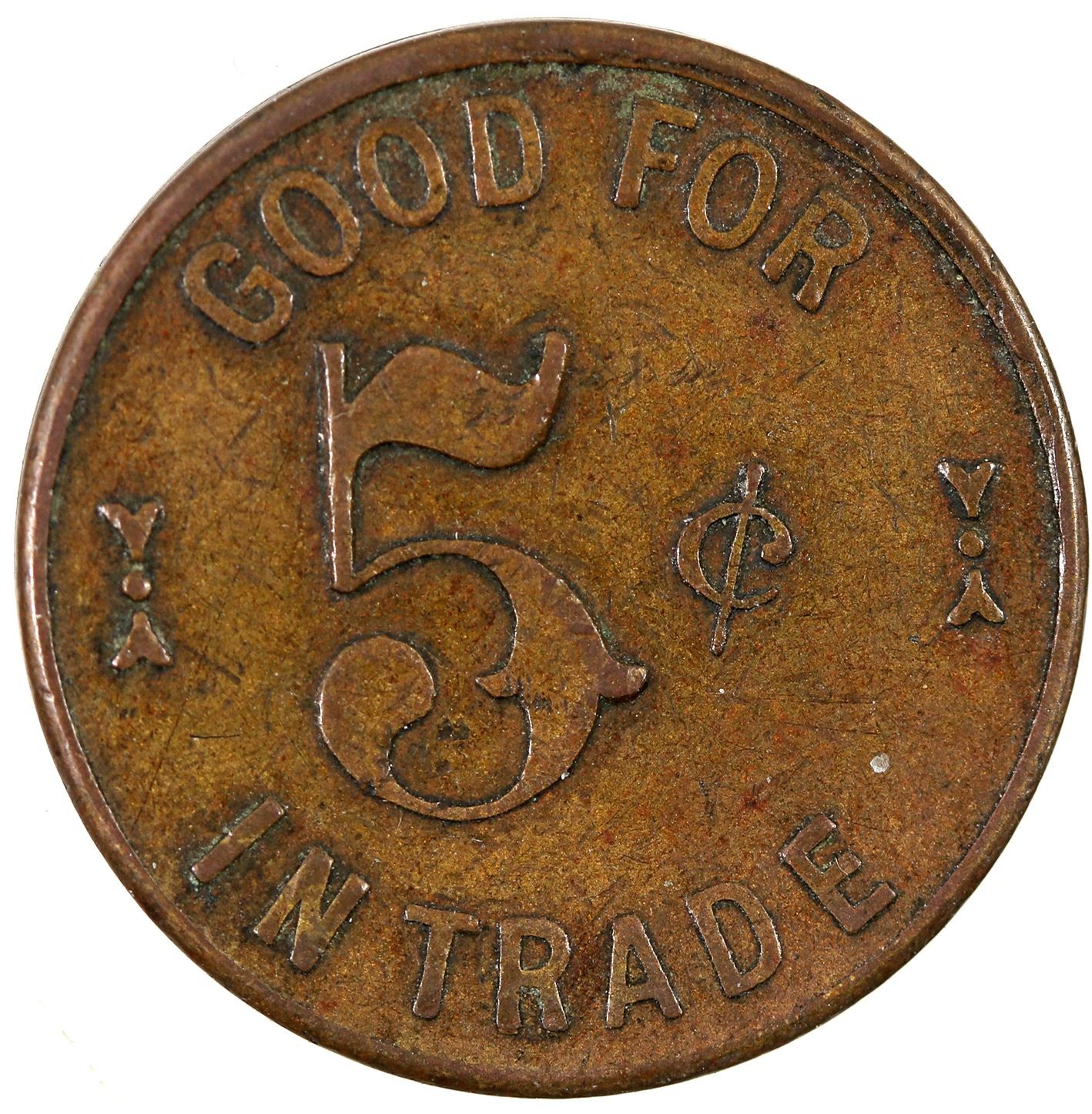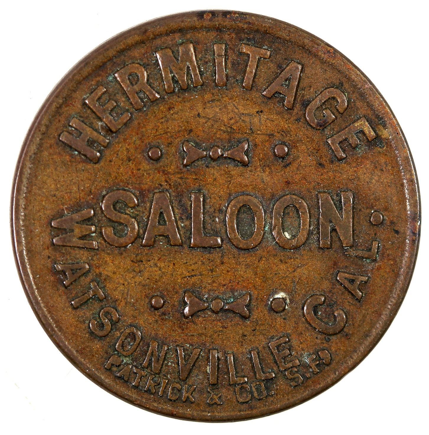 Located at 236 Main Street in the 1907 directory: HERMITAGE / SALOON / WATSONVILLE, CAL. / PATRICK & CO. S.F. // GOOD FOR / 5¢ / IN TRADE; Br., rd., 21 mm.[ Watsonville California
