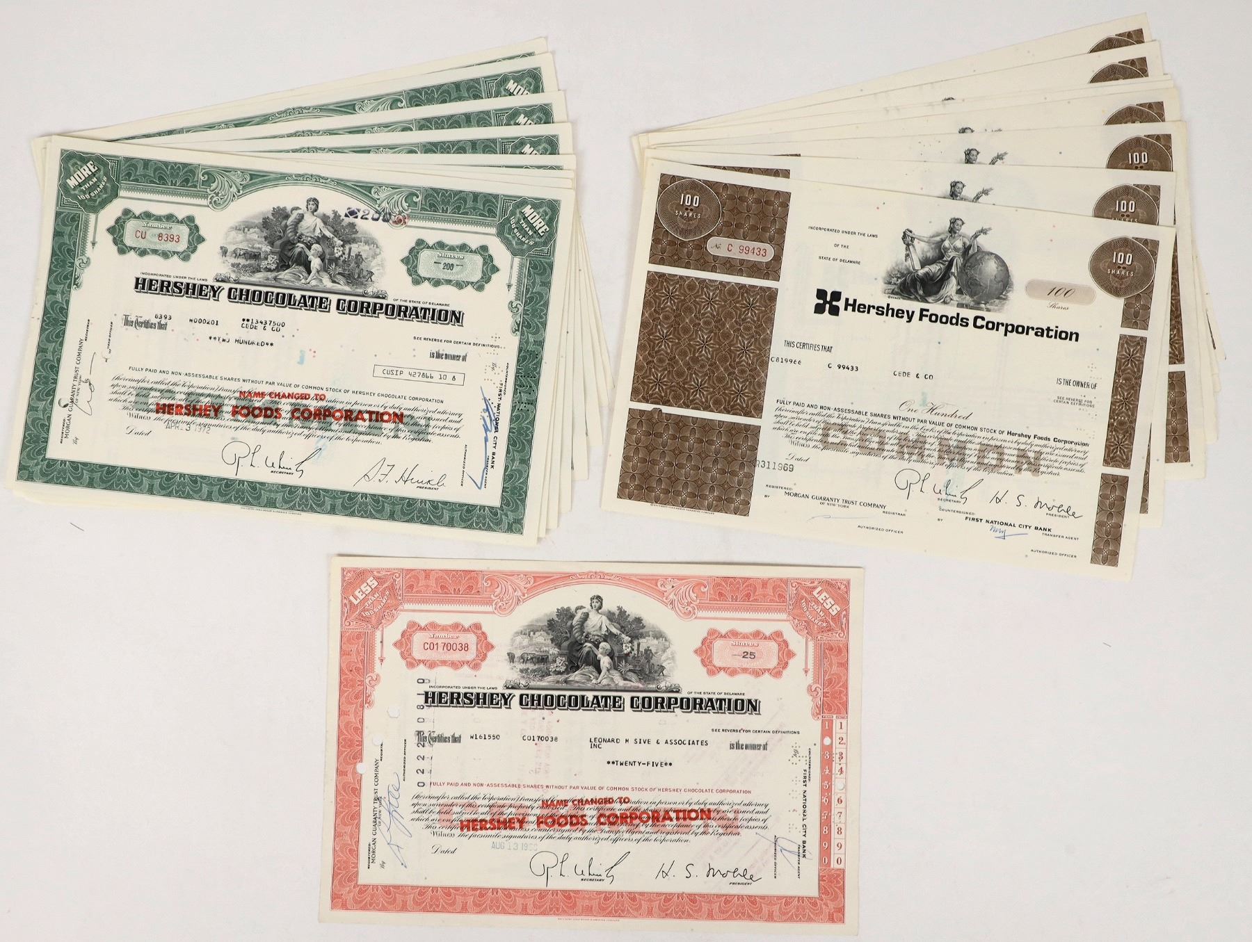 There are nineteen stock certificates for the Hershey Food Corp. and Hershey Chocolate Corp. There are ten 100 share stocks in brown ink 1969; 8 green ink stocks for the Chocolate Corp. 1972; and one red ink stock from 1988. Please see photo for details.