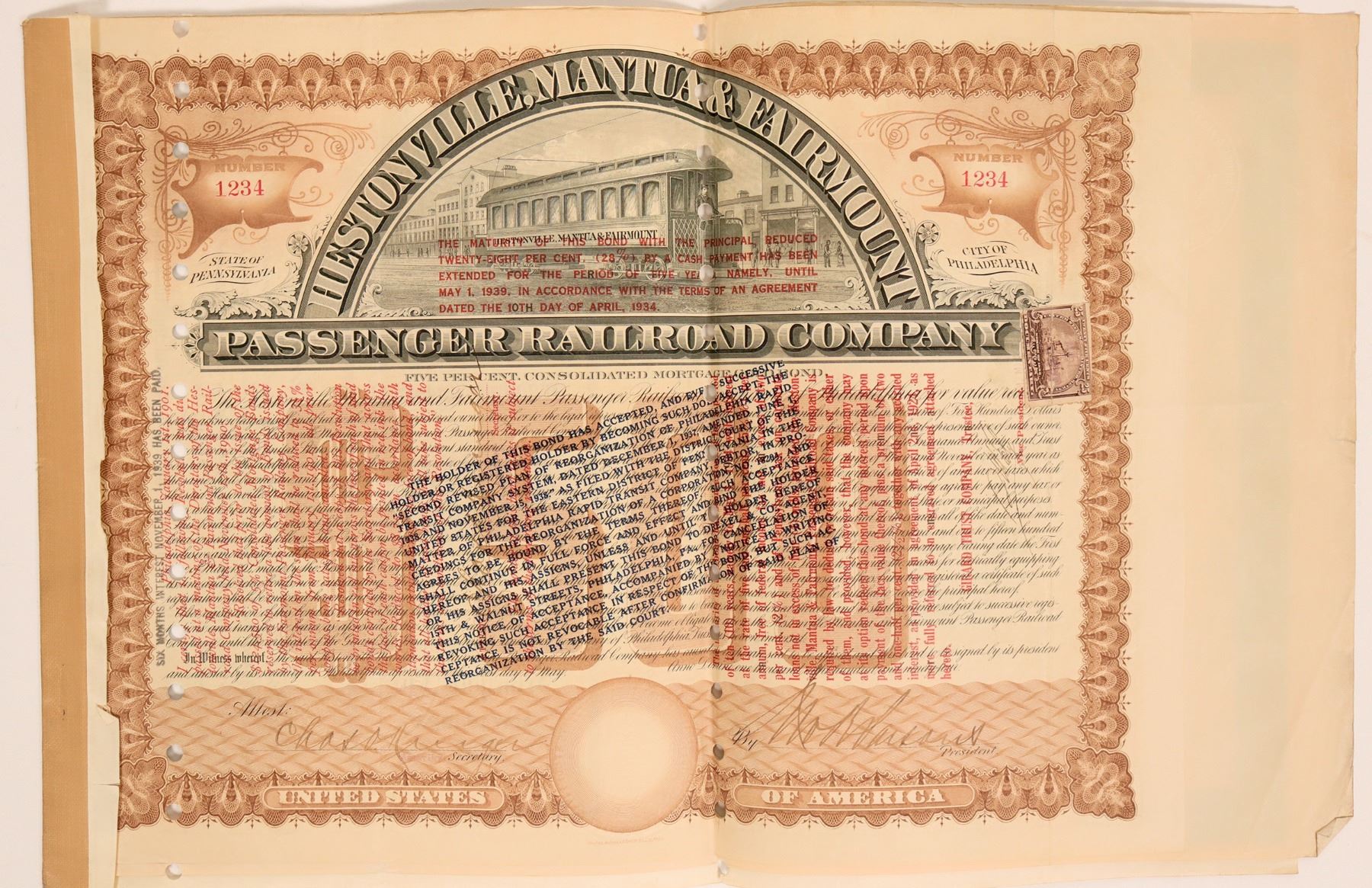 3 certificates. Incorp. 1869 Pennsylvania. 1. #1234, I/C, $360 Consolidated Mortgage Extension Contract Due 1939, issued May 1, 1934 signed H.R. Otley president. Green, embossed seal, street cat in oval center panel. American Bank Note Co printer. F 2. #1234, I/C, $500, 5%, Consolidated Mortgage Gold bearer bond issued May 1, 1894 signed -illegible, Brown, embossed seal, vignette top street cart l-r, $500 brown underprint. Huston, Ashmead , Smith Co printer.VF 3. #1234, I/C, $500 Consolidated Mortgage Extension Contract Due 1934 signed-illegible. Green, embossed seal, vignette street car in oval center panel. American Bank Note Co.printer.VF. These three are bound together as original bond and two extensions.