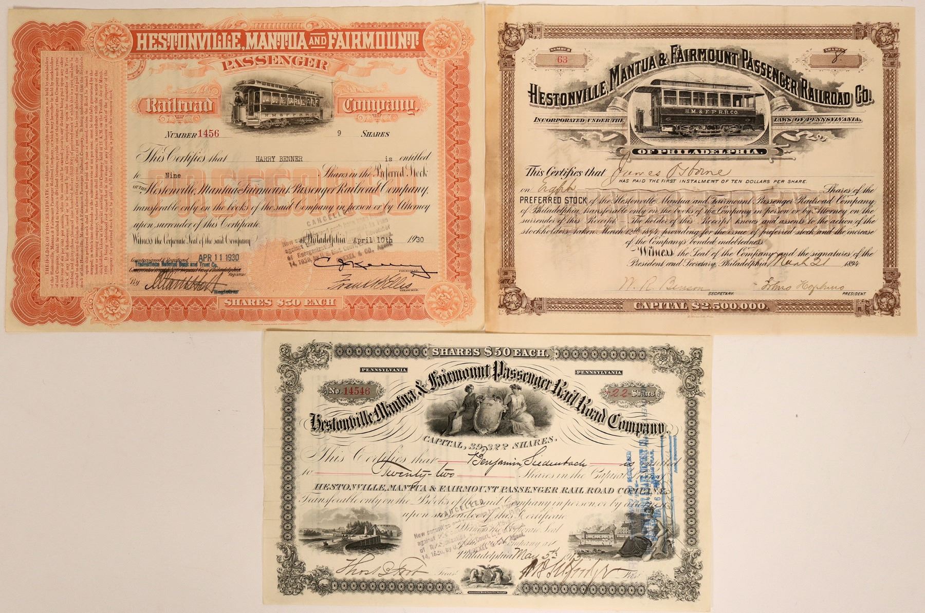 3 certificates. Incorp 1869 Pennsylvania. 1. #1456, I/C, 9 shares @ $50 par issued April 10, 1930 signed Frank B. Ellis president. Orange, embossed seal, vignette top electric street car r-l w/brakeman at wheel. PREFERRED in orange underprint, American Bank Note Printer. VF 2. $63, I/U, 8 shares preferred @ $50 par. issued March 21, 1894, embosses seal (crisp), Brown, vignette top under wavy title electric street car w/company name on side, SHARES $50 EACH brown underprint. McManus Litho printer. VF 3. #14546, I/C, 22 shares @ $50 par issued Mar 5, 1913 signed illegible, Black, embossed seal, 4 vignettes : top allegorical females hold shield, left bottom country scene w/bridge into town, bottom center state seal, bottom right allegorical female. American Bank Note Co. printer.EF