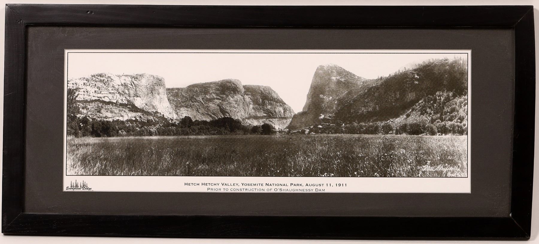 This is a half tone print of Hetchy Hetchy Valley in Yosemite National Park. Original photo taken in 1911 prior to dam construction. Framed at 21 in. X 9 in.