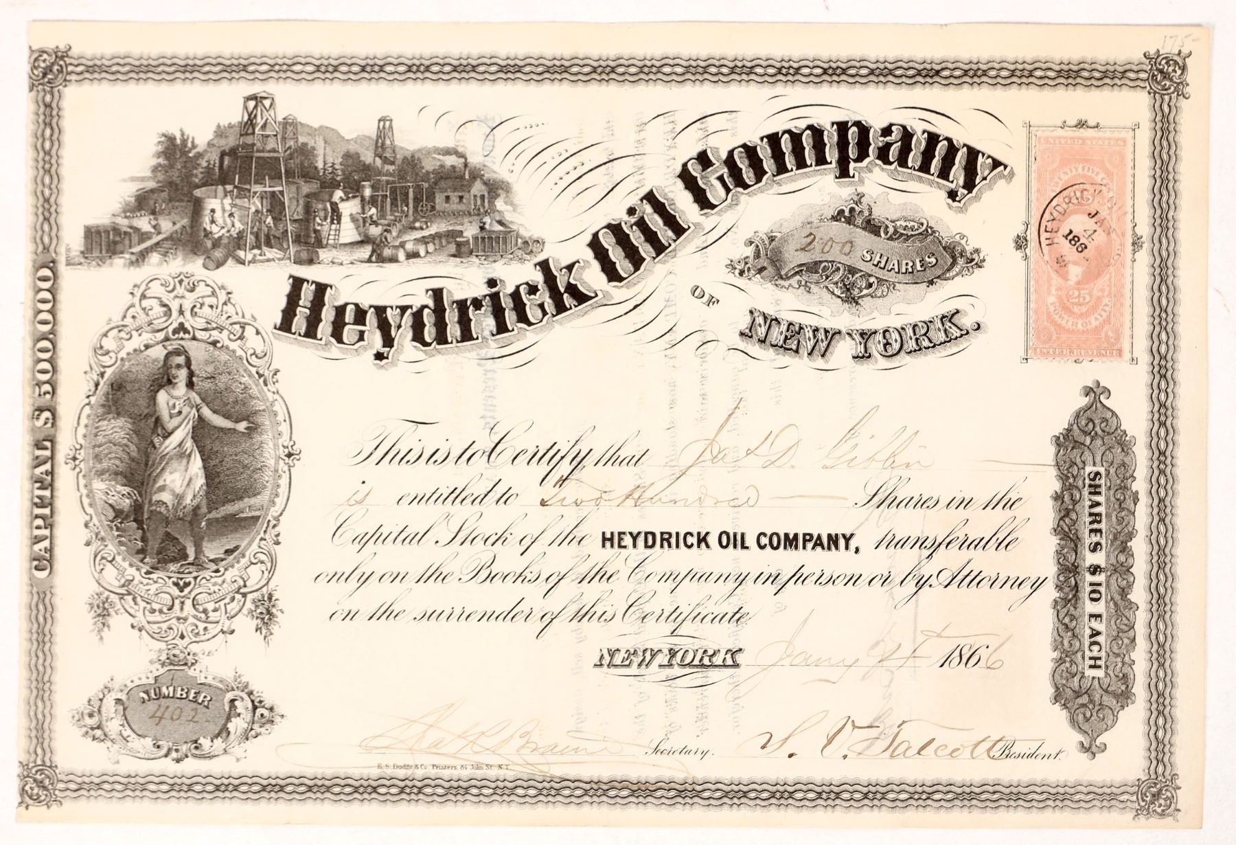 A stock certificate for 200 shares in the Heydrick Oil Company of New York, made out to J.D. Gibbon in 1866. No. 401 issued. Signed by secretary (illegible) and president J.V. Talcott; embossed company seal at left. 25¢ IR Power of Atty. stamp in frame at top right. Two vignettes, one of men at work processing oil and one of a Native American woman. Trimmed tight at left and bottom; some very minor creasing, but otherwise great condition.