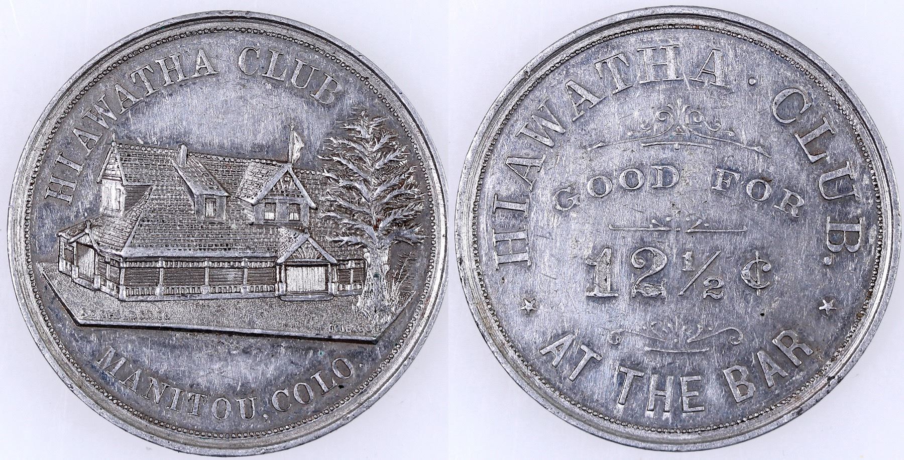 Pictorial token from the El Paso County town: HIAWATHA CLUB / (Clubhouse) / S.D. CHILDS & CO. CHICAGO / MANITOU, COLO. // HIAWATHA CLUB. / GOOD FOR / 12Ω¢ / AT THE BAR; Al., Rd., 37 mm.