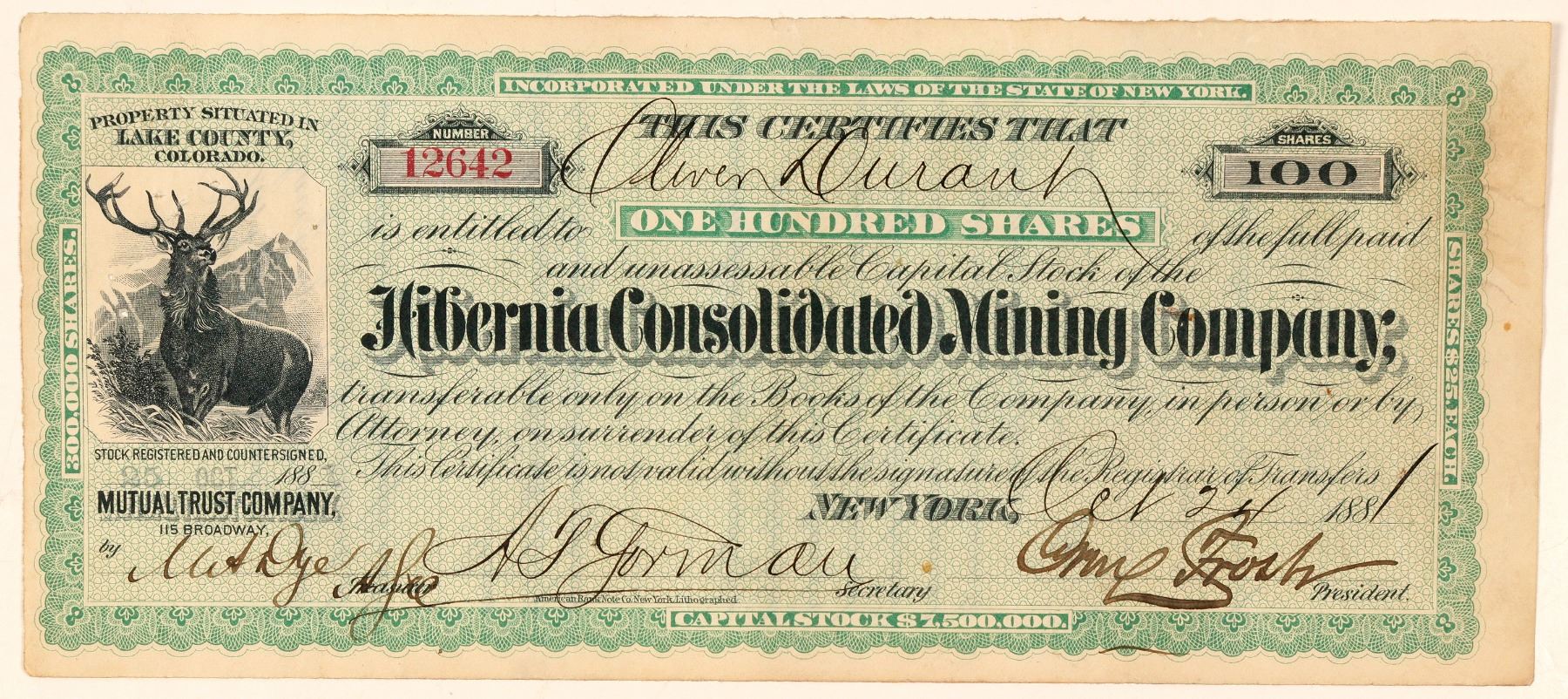 Property Situated in Lake County, Colorado (printed at upper left). Inc. in New York. No. 12642, issued for 100 shares to Oliver Durant on Oct. 24th, 1881. Signed by the president and secretary. Not cancelled. Small certificate 4 x 9.25" Green border and background, elk vignette. Printed by ABN. Pinholes, folds. The Hibernia was located next to the Robert E. Lee and Matchless on Fryer Hill, California District, one mile from Leadville. Vein is a horizontal contact. Extensive development. [Corregan & Lingane, 1883, pg. 416] () Ken Prag Collection