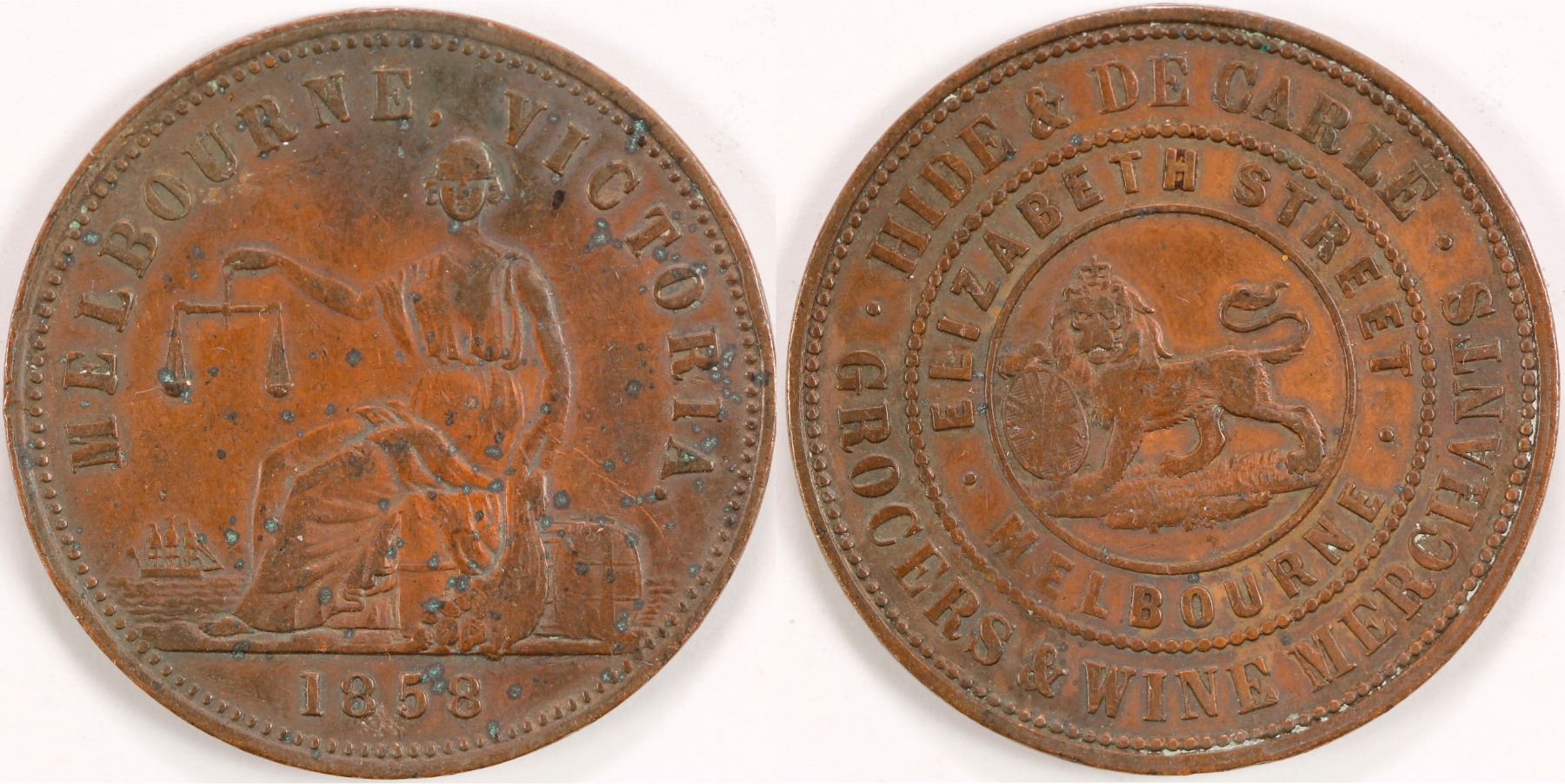 Obv.: Melbourne, Victoria / 1858; Rev.: Hide & De Carle / Grocers and Wine Merchants / Elizabeth Street / Melbourne. C, rd., 34 mm. Thomas Hide and Edward De Carle formed a partnership in 1857. They founded a Grocery, Wine and Spirit merchant's business on Elizabeth Street, which lasted until 1861. Hide and De Carle issued a total of 16 types of penny and half penny tokens, eight in 1857 and eight in 1858. All the tokens were struck by Heaton and Sons of Birmingham.