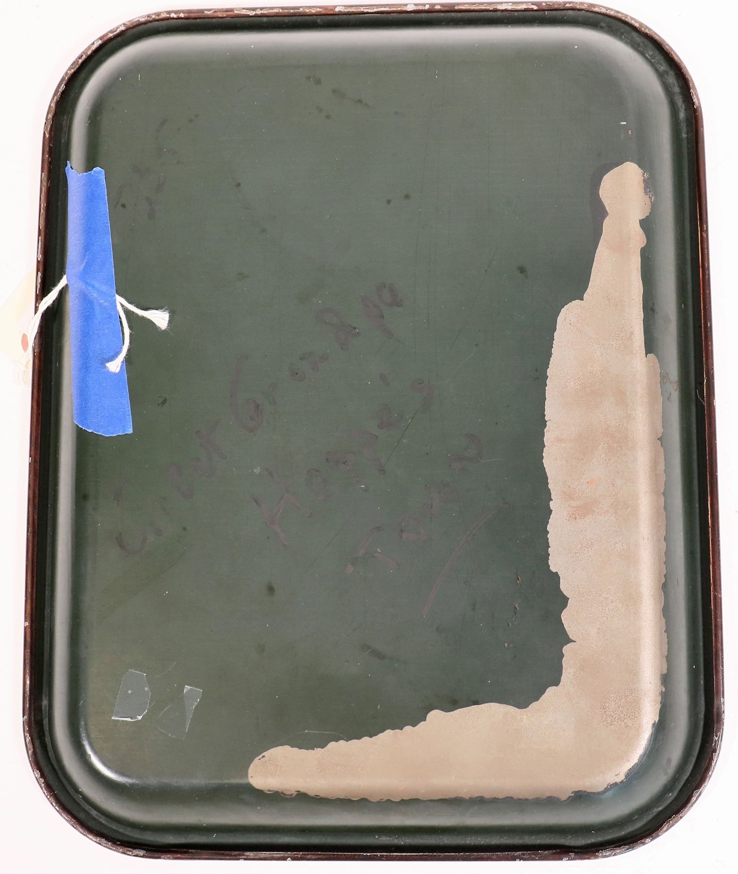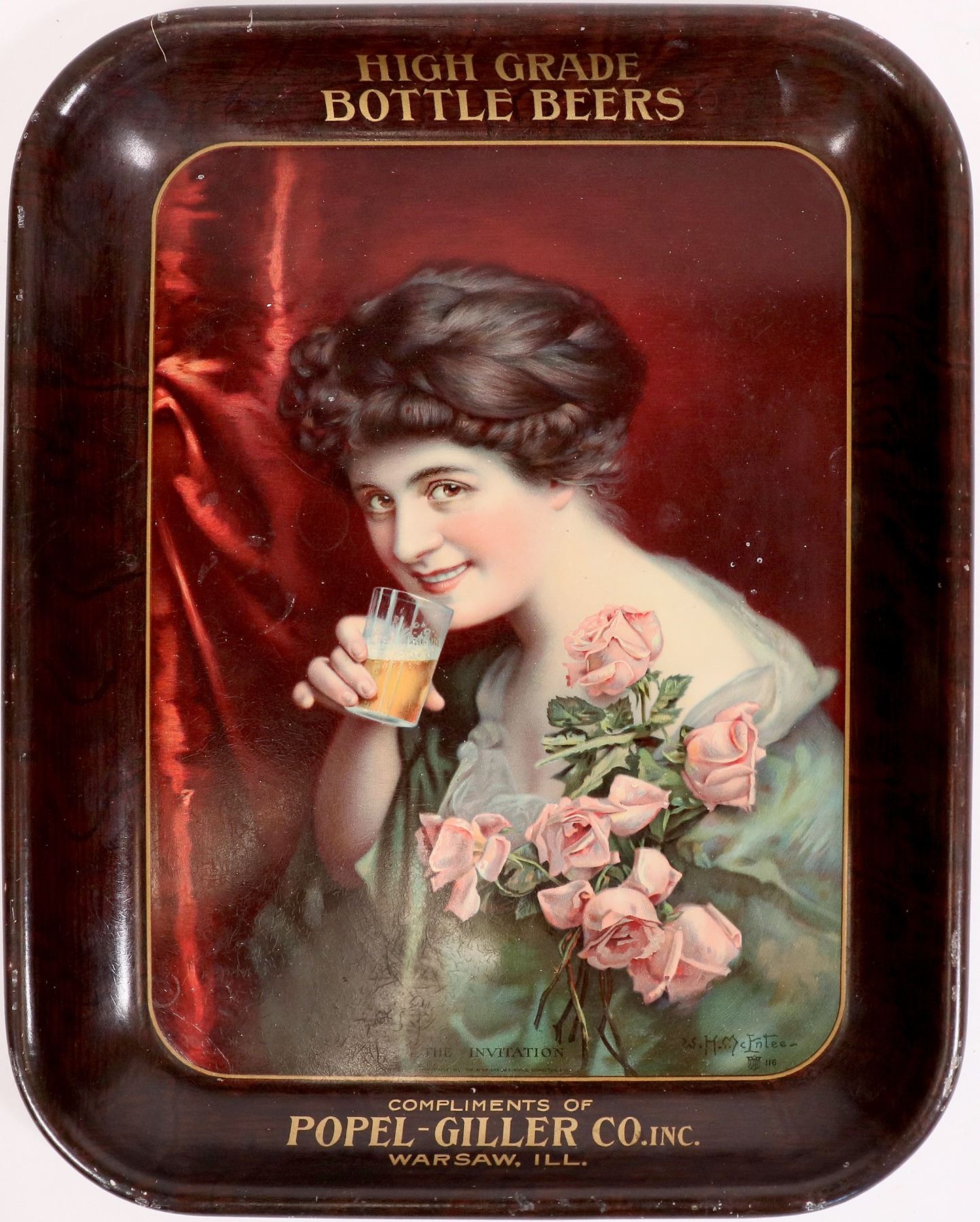 High Grade Bottle Beers Company Adverting for Popel-Giller Co. This very fine beer tray measures 10.5 in. X 13.25 in. titled "the Invitation, W.H. McEntee/ AAW 116/ copyrighted 1911 by the American Art Works Coshocton, Ohio/ Compliments of Popel-Giller Co. Inc./ Warsaw, Ill." A dark red tray depicting a young lady enjoying a beer along with her roses.Minor surface crazing, minor edge chips very good condition. Pre-Pro. Warsaw Illinois c. 1911
