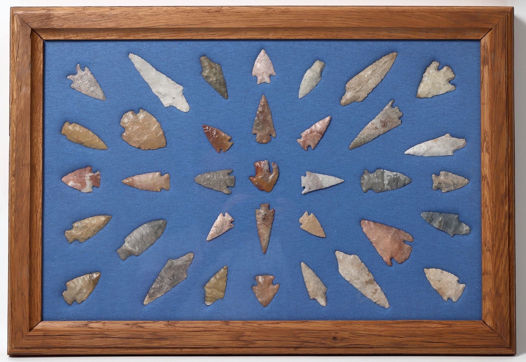 This lot has three display frames of points. The walnut framed boxe has points collected from Kay County, Oklahoma only. The other two frames contain points from the South Eastern United States; about 100 points in all. Very fine specimens from 1.5 in./ 39 mm to 4 in./ 102 mm. From the Gary Bracken collection. Please see photos for details. State: Oklahoma, Provenance: Gary Bracken Collection