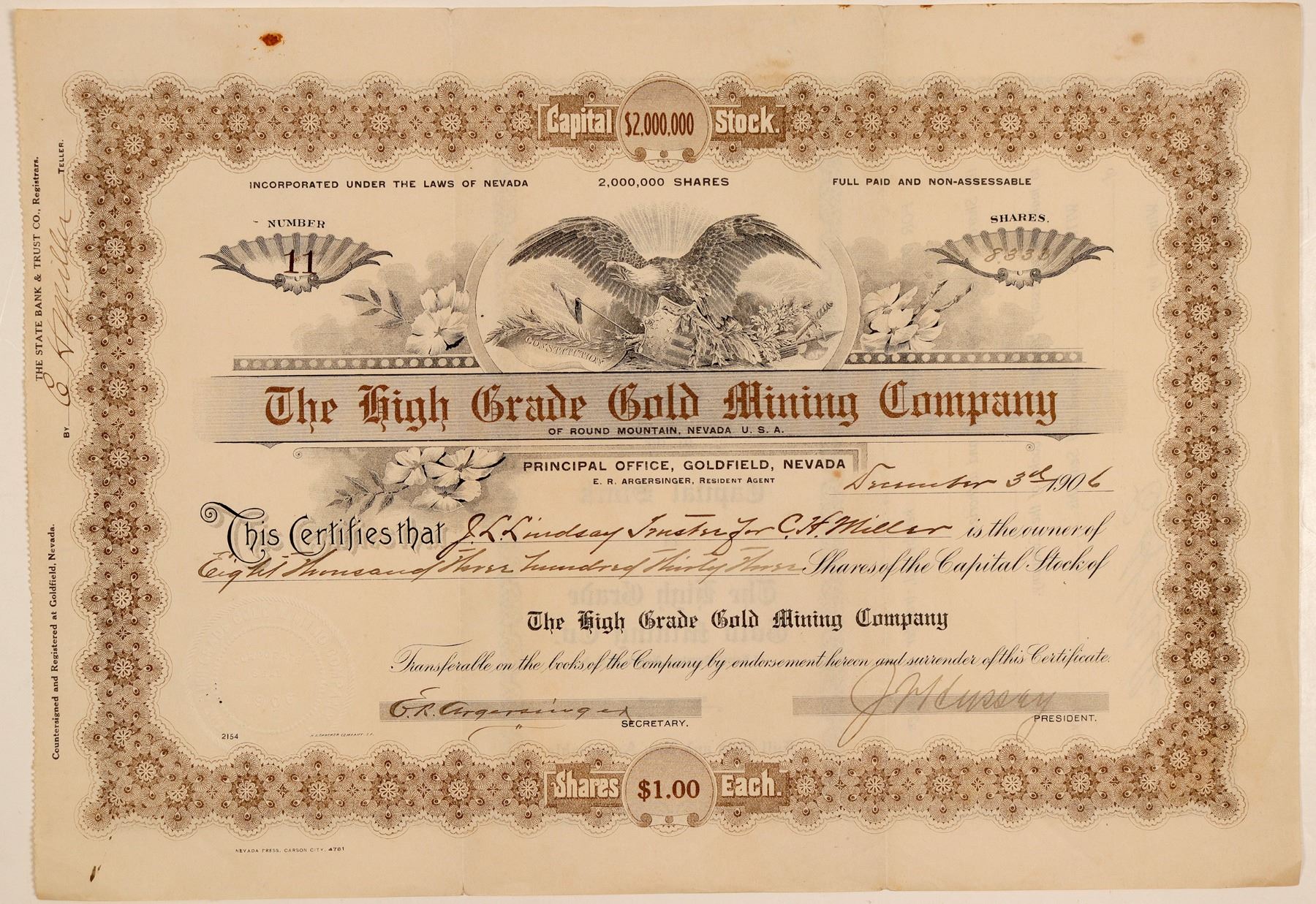 "of Round Mountain, Nevada." Round Mountain actually did produce high grade gold, so the name is appropriate! Inc. in Nevada. Principal office in Goldfield. Low number 11, issued for 8,333 shares on Dec. 3rd, 1906 to JL Lindsay. Signed by president JV Hussey and secretary E.R. Argersinger. Not cancelled. Maroon border and title, black print, floral design with eagle vignette. Printed by Nevada Press, Carson City. Heavy folds, stains. 9 x 12.5" According to the Goldfield Gossip, the company had 170 acres and had developed shafts. Ken Prag Collection