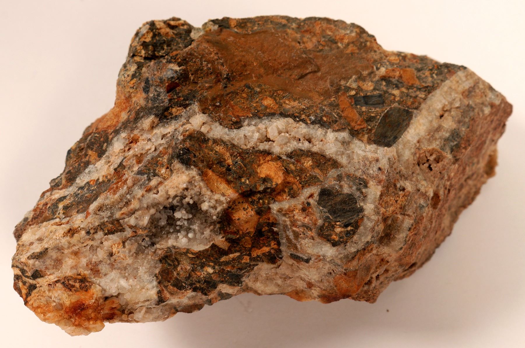 High-grade gold-silver ore from the January Mine in Goldfield, Nye County, Nevada, approx 125 x 85 x 60 mm. Highly brecciated, quartz-filled, rhyolite porphyry, with druzy quartz-filled cavities and densely mineralized with dark, silver-grey material, probably gold- and silver-bearing argentite. The January Mine was one of several producers in the Goldfield District that have long been closed. This specimen marks that great history as an attractive piece in its own right and as part of the legacy that brought significant money and manpower to central Nevada in the early 1900s. State: Nevada City: Goldfield Date: