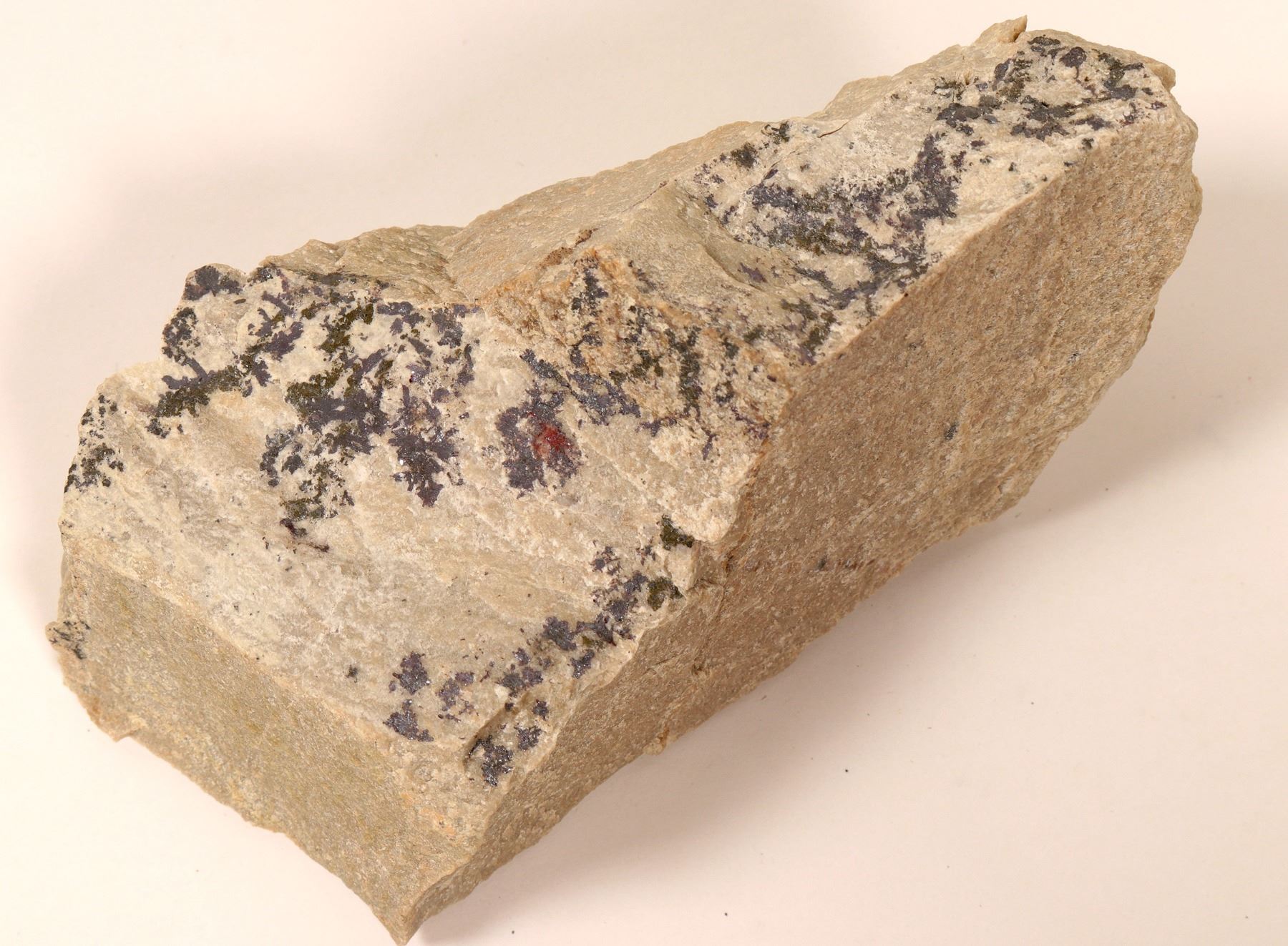 High-grade silver ore from the Sunshine Mine near Kellogg, Idaho, approx 135 x 75 x 50 mm. Specimen is metamorphosed quartzite with encrustations of silvery-grey mineralization identified by the collector as pyrargyrite -- a silver-antimony-sulfide, sometimes called ruby silver when it appears reddish in color. The original collector identified this piece as coming from the D-Vein at the 3700-foot level of the Sunshine Mine. This is a nice-size specimen from this famous silver mining district that will be good for display on a desk or shelf.