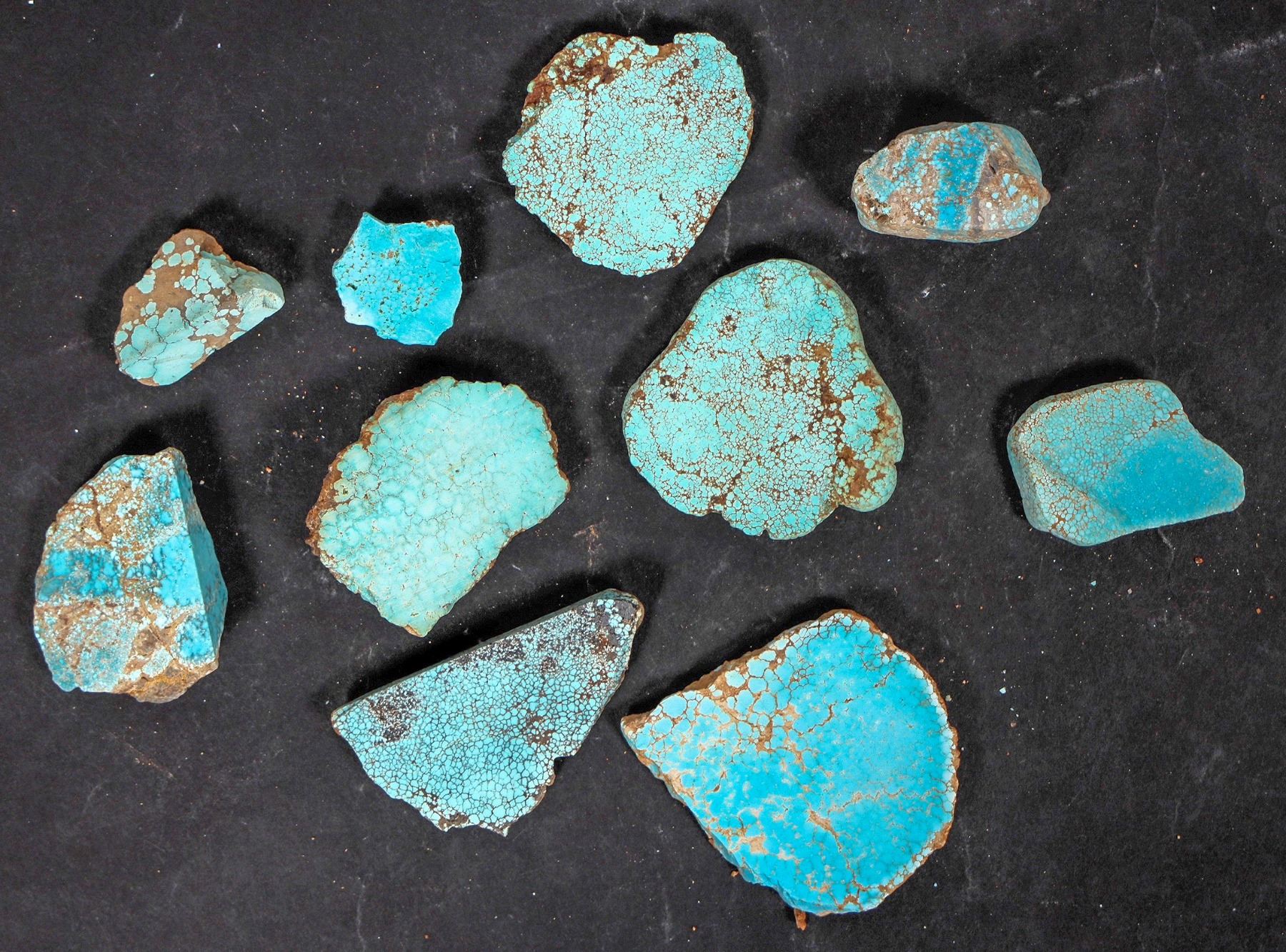Hand-selected, high grade turquoise -- small-medium cut pieces, untreated. Excellent spiderweb matrix. Medium to light blue in color, greenish cast on a some. Approximate weight 6.6 ounces. Pieces in the lot range from around 1" to 2.25" in length. This turquoise originates from the No. 8 turquoise mine of Cortez, Nevada, often considered one of the top turquoise mines in the world. It was previously in storage for 35 years.