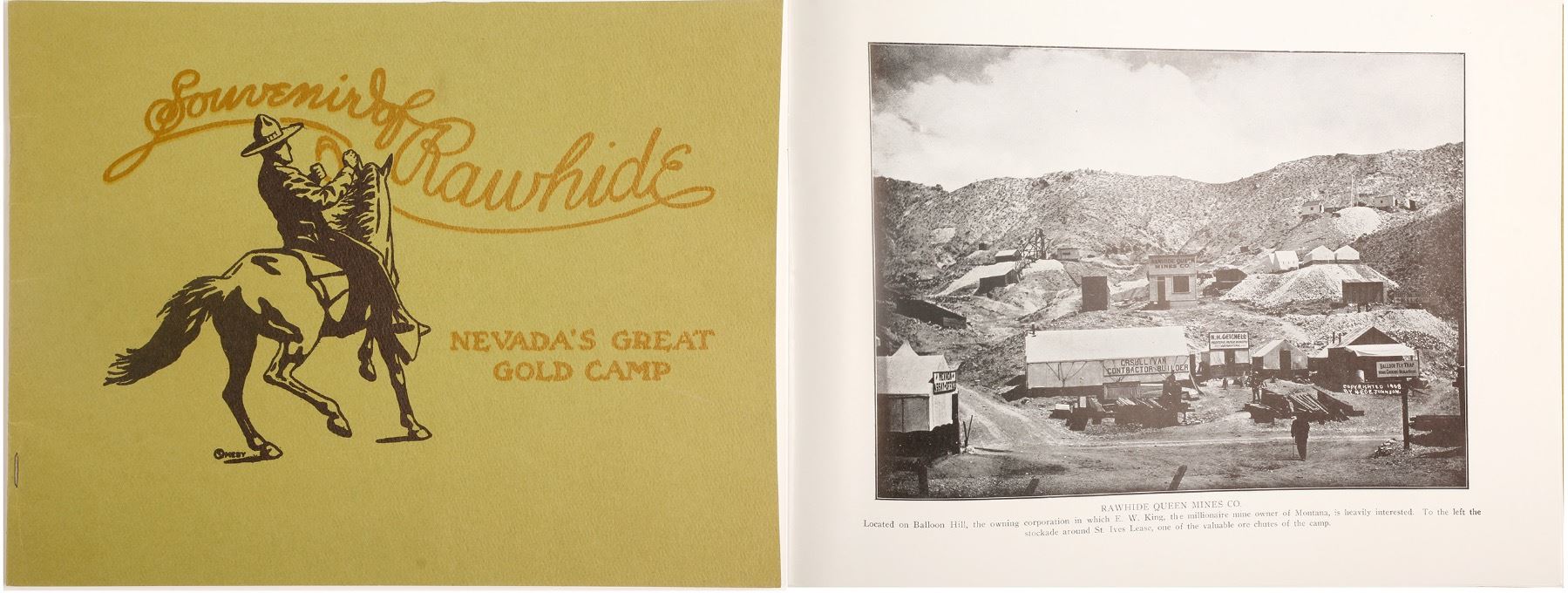c.1960 high quality reprint of "Souvenir of Rawhide: Nevada's Great Gold Camp." Originally published in 1908 by and featuring photographs from NE Johnson. Pages not numbered, but many high quality black and white photographs of the camp and a fold-out panorama in the back. Green softcover, staple binding. 8 x 10.5" Though not a 1908 copy, the pictures are the same and worthy of a Nevada collector's library. HWAC# 60078 Date: Location: Rawhide, Nevada