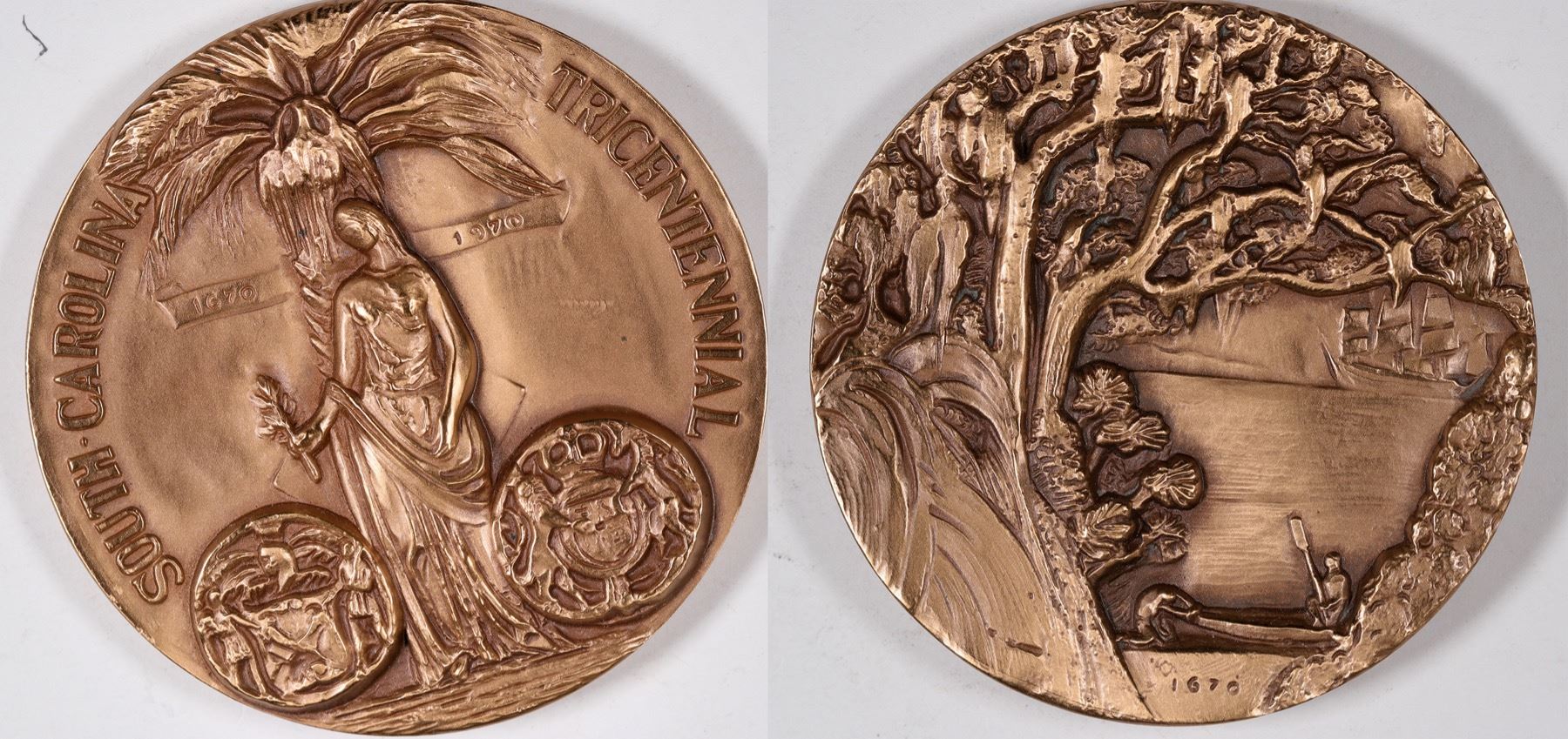South Carolina: Impressive high relief Medallic Art Co. 1970 South Carolina Tricentennial Bronze medal. 76mm, Unc.