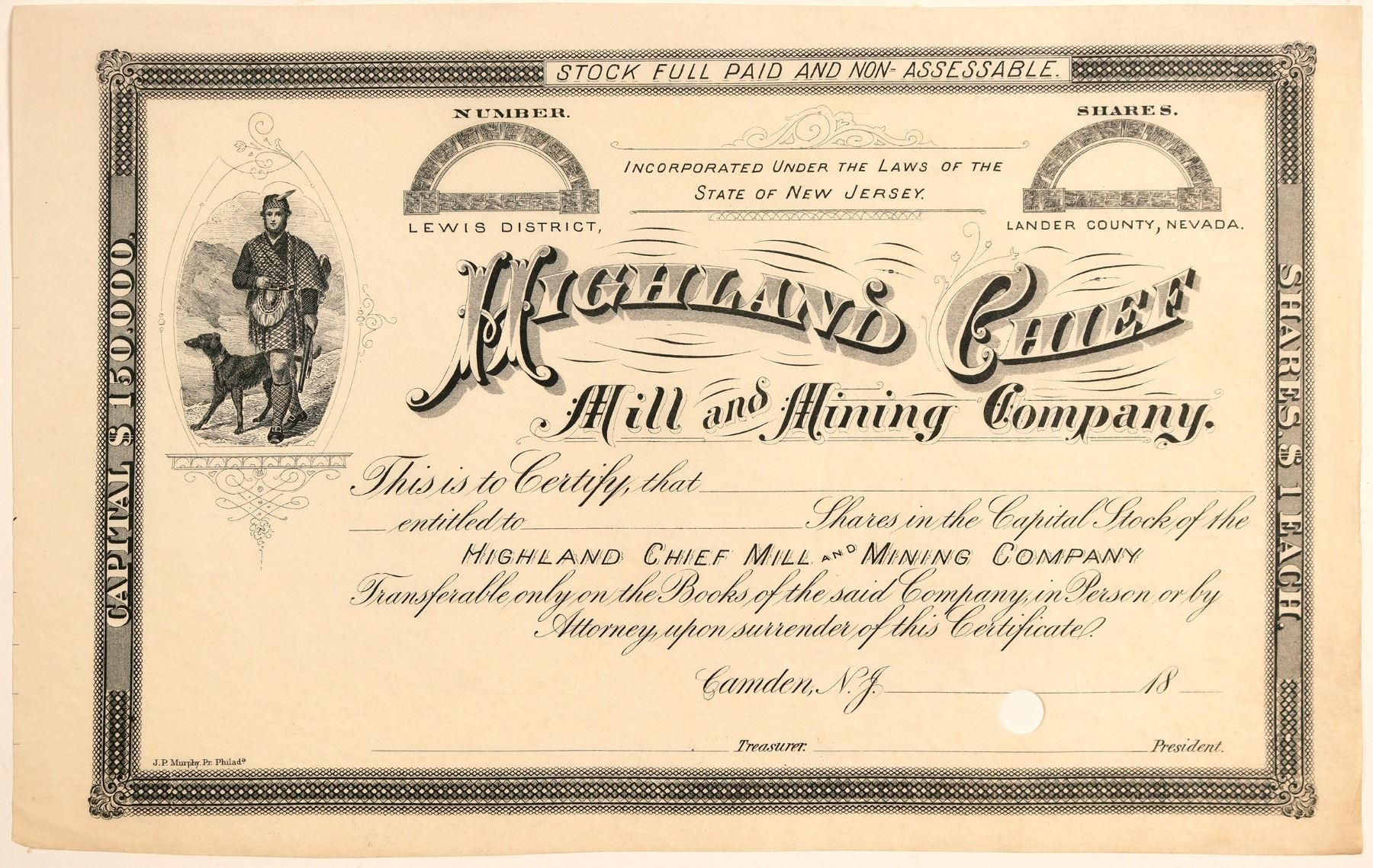 Seems to be a printer's sample or proof. One large hole punch. Location: Lewis District, Lander County. Man dressed in highland attire with faithful gog. Incorporated in New Jersey. With the promise of the Nevada Central Railroad the Highland Chief built a 40 stamp mill at Star Grove in 1881. The Highland Chief Mill closed down in 1883, sealing the town of Lewis's fate. Ken Prag Collection