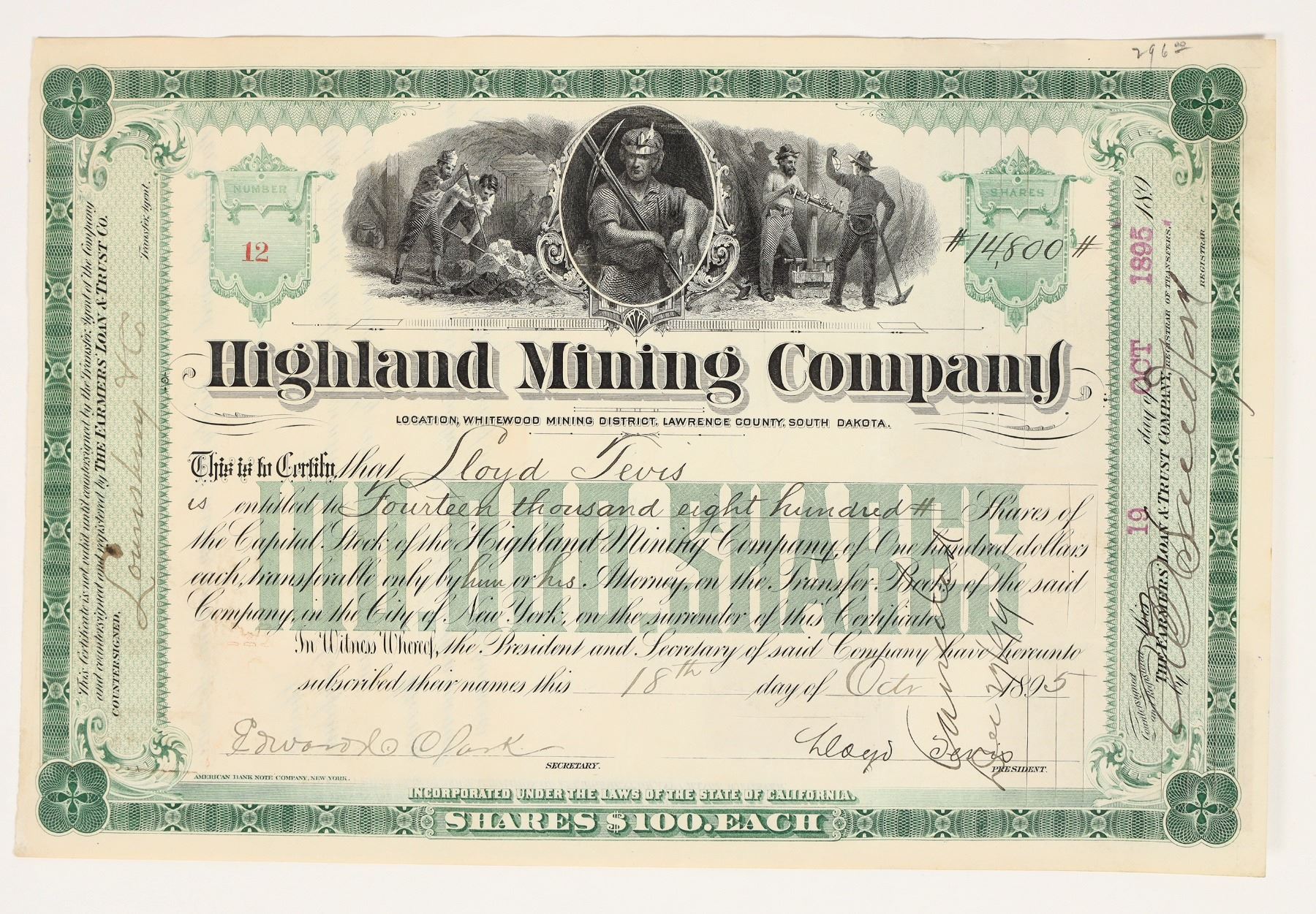 The Highland Mining Company was one of the largest producing gold mines at lead, and owned by the Hearst-Haggin-Tevis group. This certificate no. 12 was issued to Tevis for 14,800 shares in 1895. Tevis was also president of the Homestake Mining Co. as well as Wells Fargo at one point.