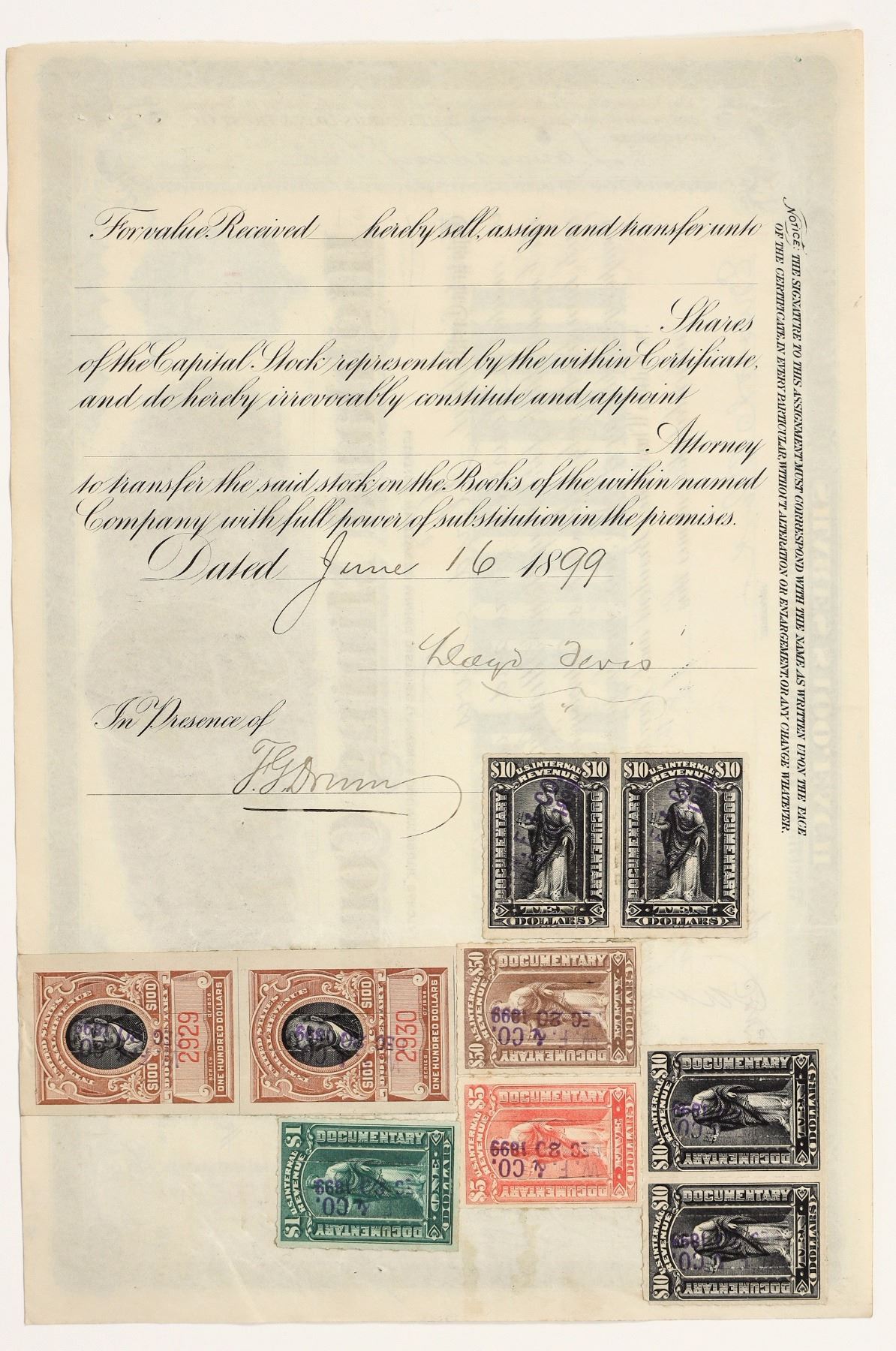 This is a choice certificate with $296 in US revenue stamps on the back. Each has been carefully cut cancelled as proof the certificate had paid the very expensive tax.