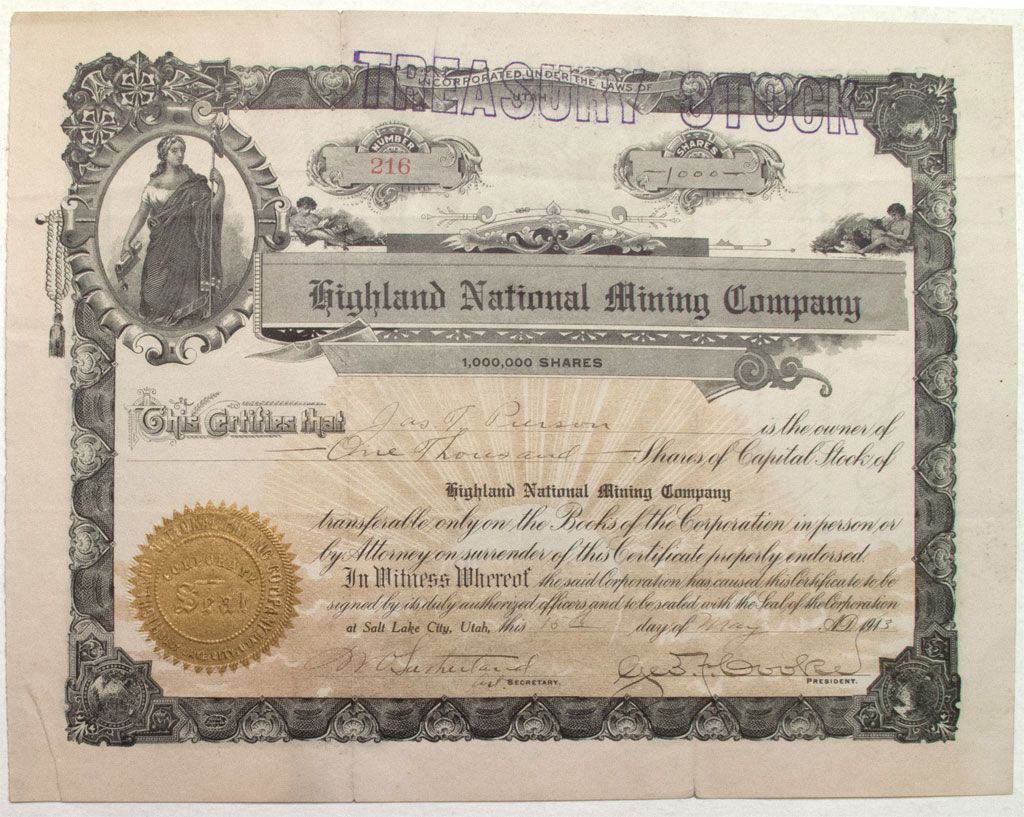 Certificate from the Highland National Mining Company issued in 1913. Inc. in Utah. The company operated the Highland National group of claims at Pioche, Nevada. Issued to Jas. T. Pierson for 1,000 shares and signed by Geo. F. Cooke as president. The company was operating an 80 acre tract next to the Mendha mine. These shares were shares of Treasury Stock. Wear at folds. Uncancelled. Date 1913 Austin, NV hwac 8752