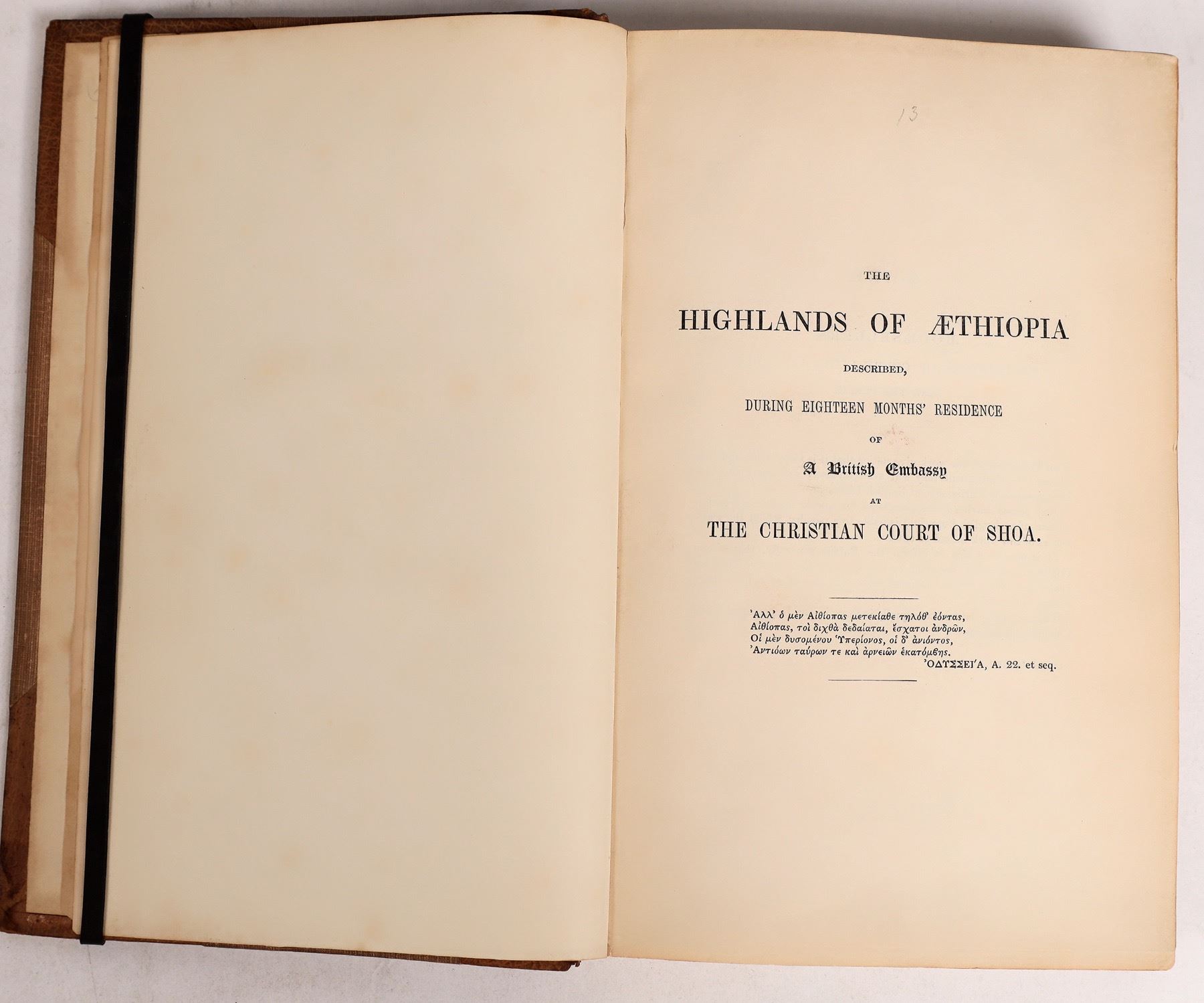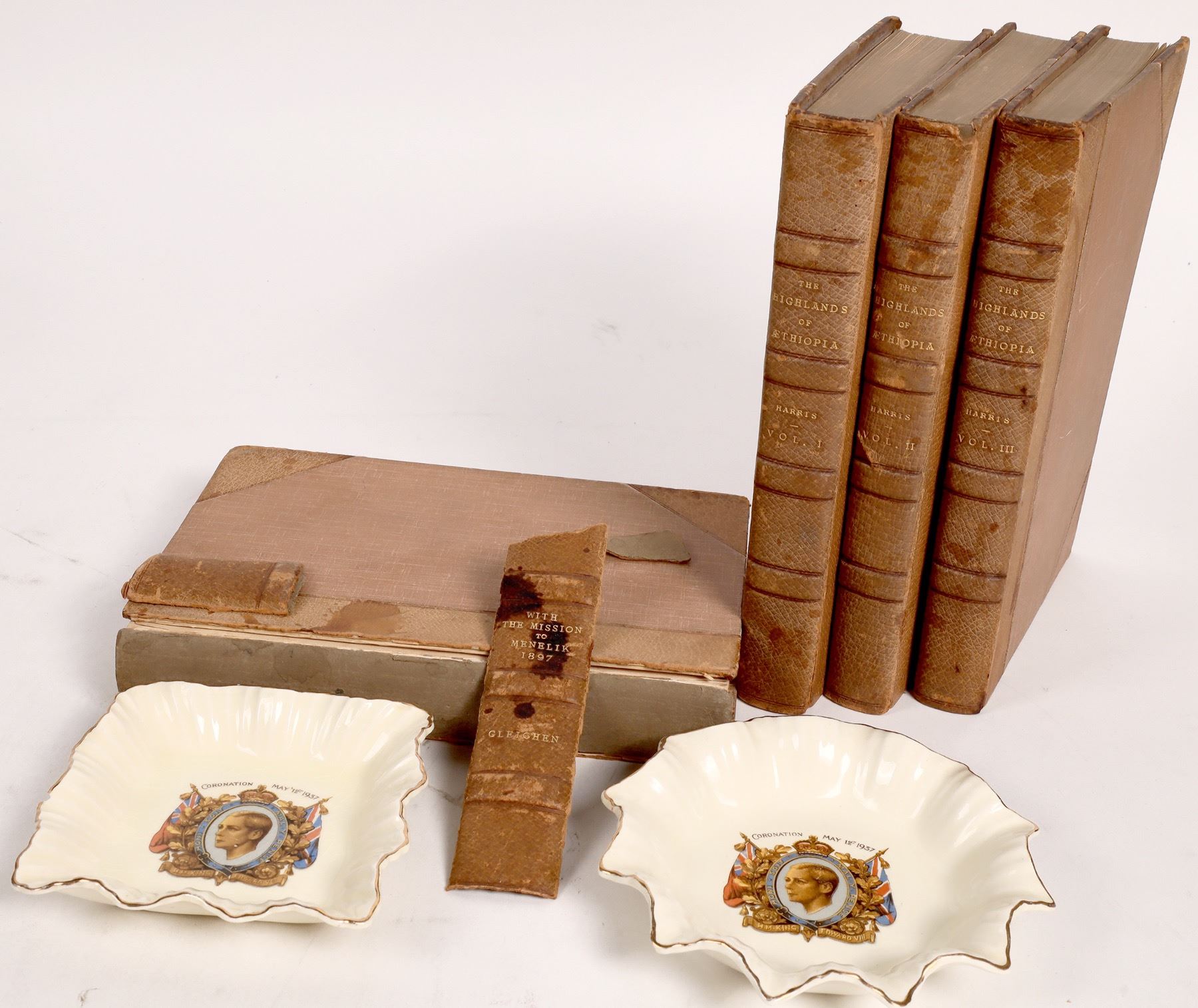 From a family whose descendants were from England and serving as missionaries in Ethiopia. Highlands of Ethiopia Described, During Eighteen Months' Residence of a British Embassy at the Christian Court of Shoa. 1844 printing, volumes 1-3 with pullout map of Abyssinia. The Mission to Menenlik by Count Gleichen, 1898 printing, 363pp with foldout map of Abyssinia-broken spine and both boards detached. Light foxing on all volumes. Also 2 commemorative ashtrays from Coronation of H M King Edward VIII 1937, by J &G Meakin, England,