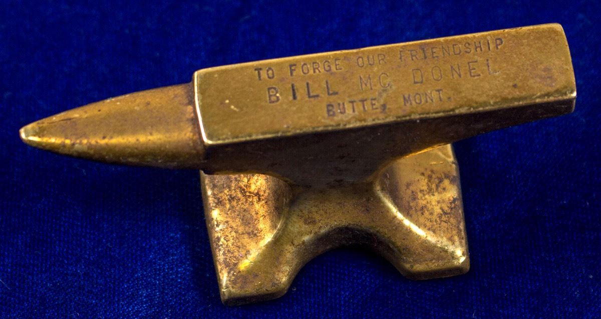 A brass souvenir anvil from Butte Montana that says "To Forge Our Friendship Bill Mc Donel". Souvenir anvils are a highly collectible item and this is a fabulous piece. 3" Long, 1.5" Tall City: Butte State: Montana, Date: Inventory# 40851