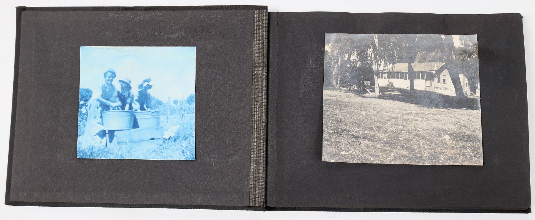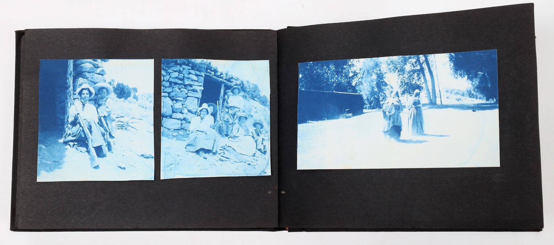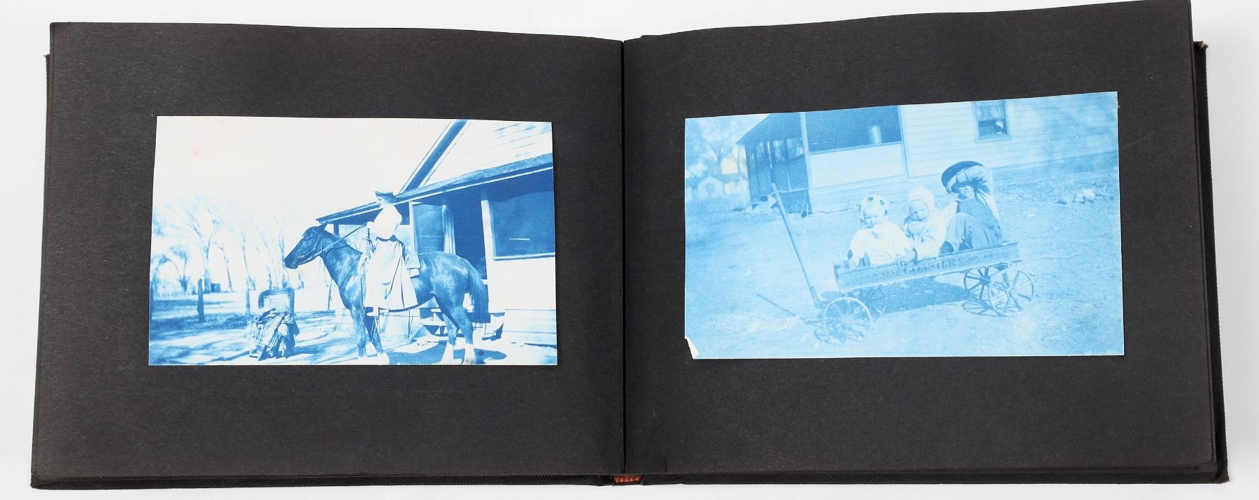 Photo album from Hiko, Nevada. In 1865, silver was discovered in Hiko and a few hundred miners rushed to the area. After the discovery, Hiko became the county seat of Lincoln County. However, the mines were never too successful in Hiko, and the mills shut down in 1869. In 1871, the Lincoln County seat was moved to Pioche. Today, Hiko is a small agrarian town with only about 100 people living there. This photo album includes photographs of homes, people, livestock, buildings, and some Indians in or around Hiko. Some of the photographs are cyanotypes. Album is 8 x 5.75 inches. Good condition.
