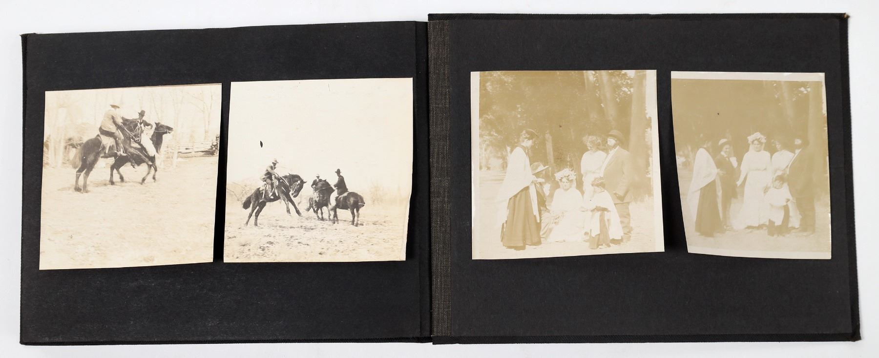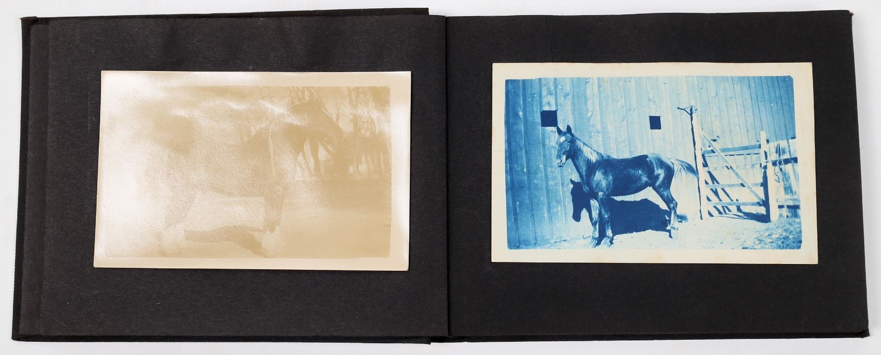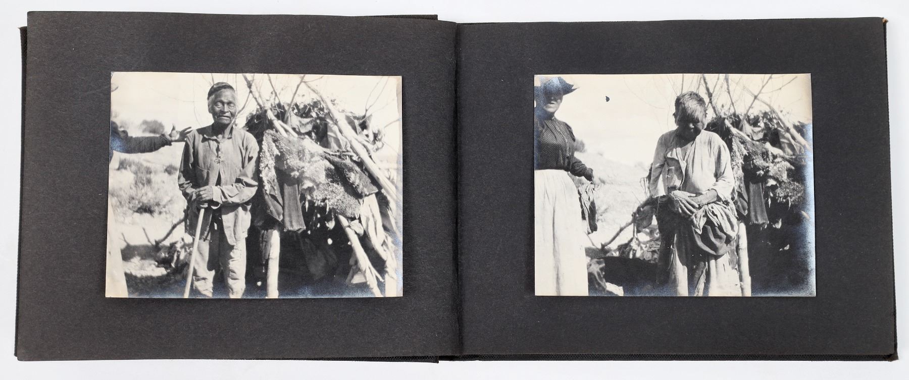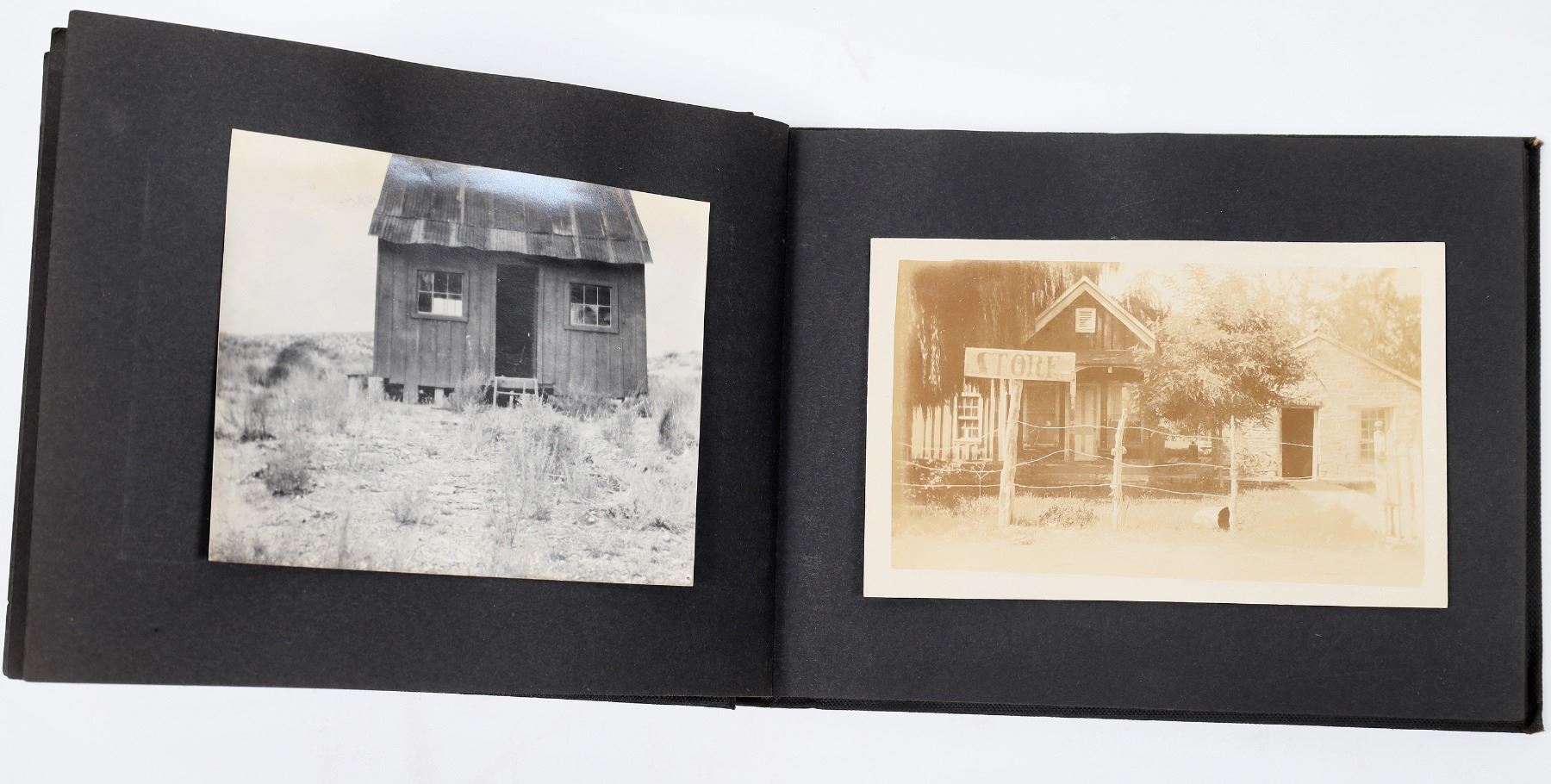 Photo album from Hiko, Nevada. In 1865, silver was discovered in Hiko and a few hundred miners rushed to the area. After the discovery, Hiko became the county seat of Lincoln County. However, the mines were never too successful in Hiko, and the mills shut down in 1869. In 1871, the Lincoln County seat was moved to Pioche. Today, Hiko is a small agrarian town with only about 100 people living there. This photo album includes photographs of homes, people, livestock, buildings, and some Indians in or around Hiko. Some of the photographs are cyanotypes. Album is 8 x 5.75 inches. Good condition.
