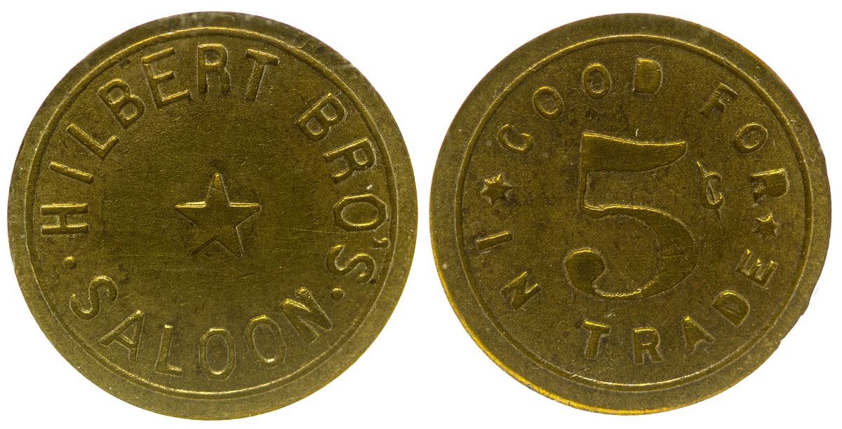 Trade token for 5c at Hilbert Bro's Saloon in Sacramento Ca. Hilbert Bro's was a whiskey merchant in San Francisco with 3 different embossed whiskey bottles from 1892-1901. See Barnett pg. 77. Hilbert Bro's / Saloon // GF / 5c / IT. Round, Brass, 20mm. City: Sacramento State: California Inventory Number: 38935