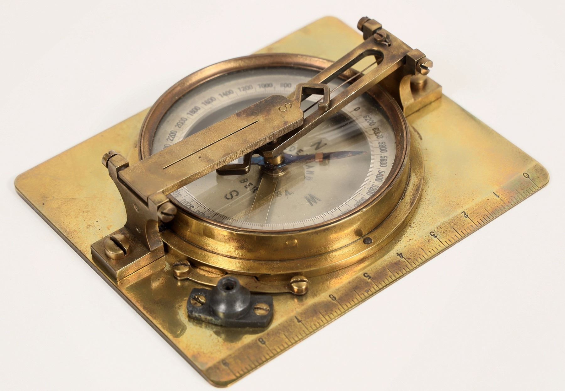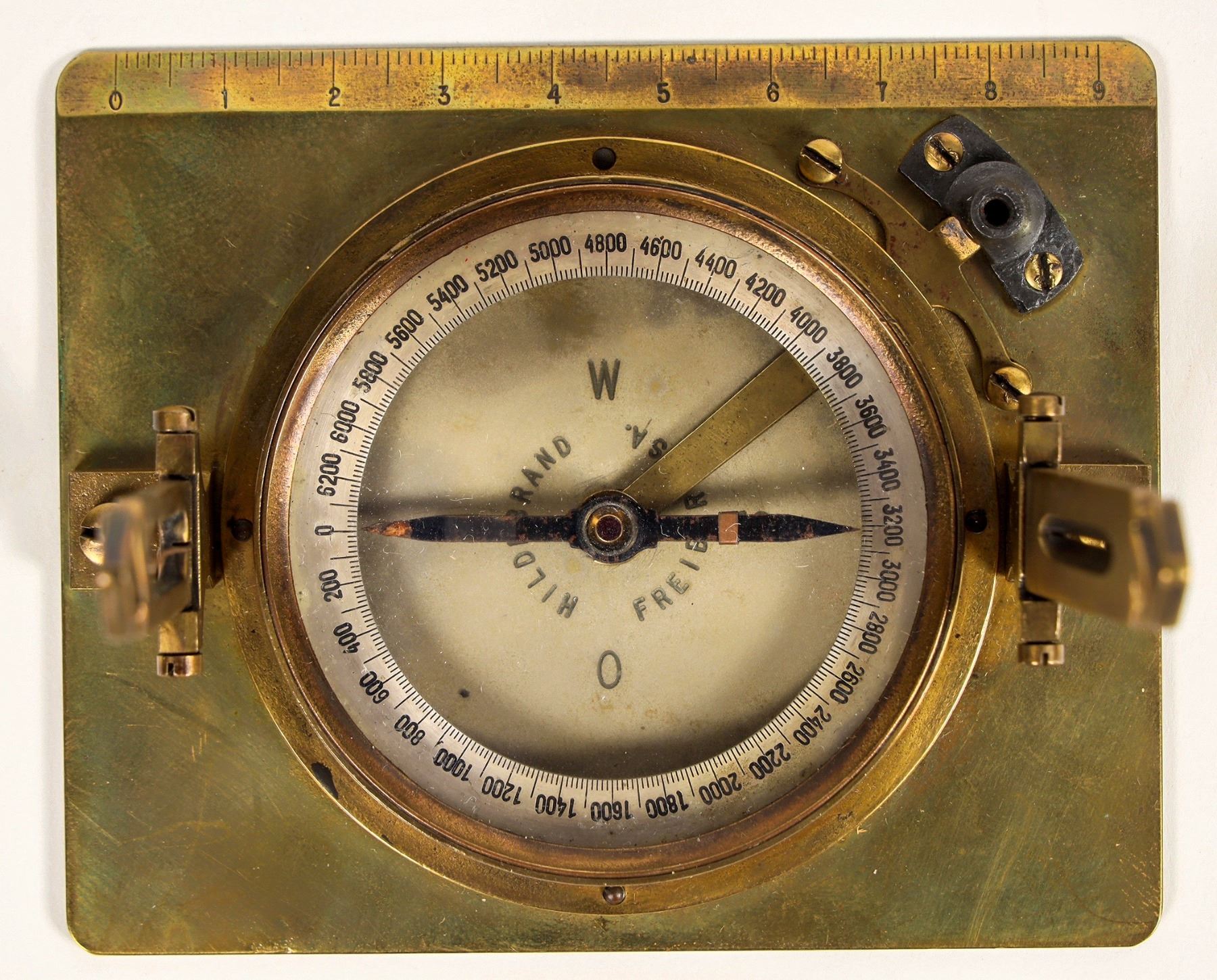 This is an artillery compass made by Hildebrand Freiber of Germany. WW2 vintage. This one has map reading capability and geographic reading arms. The needle stop screw and cover are missing in action. In fine working condition. At 3.25 in. X 4. in. From the Popovich collection. Please see photo for details.